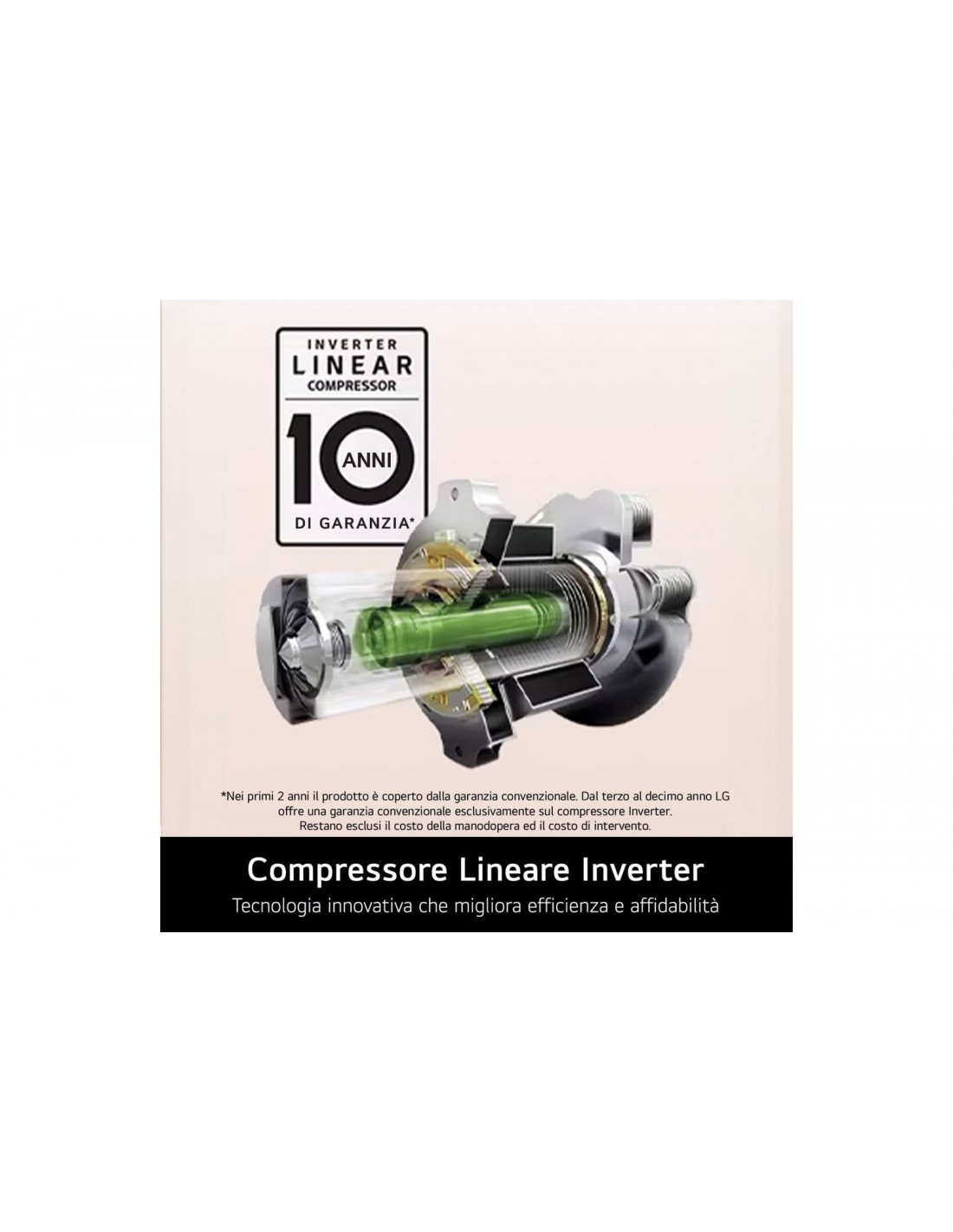 Abbiamo progettato il compressore Lineare Inverter per garantirti la massima silenziosità e affidabilità nel tempo, tanto che lo garantiamo 10 anni. Rispetto ai canonici compressori - che sfruttano meccanismi con albero motore e biella - quello Lineare ha meno punti di frizione, perché il pistone si muove solo orizzontalmente.