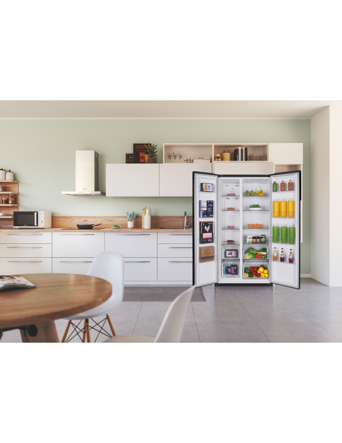 La modularità trova la sua massima espressione nei comodi ripiani estraibili, nei balconcini rimovibili, nell'active LED, nel capiente cassetto per frutta e verdura e negli accessori come il portabottiglie cromato per creare un ambiente minimale e comfortevole.