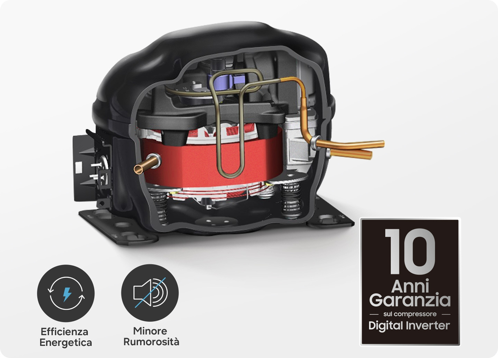 Compressore Digital Inverter con 10 anni di garanziaAlta efficienza energetica, meno rumori e prestazioni più durature. Il compressore Digital Inverter regola automaticamente la propria velocità in base alleffettiva necessità di raffreddamento. Silenzioso, efficiente e a lunga durata, il compressore è accompagnato da 10 anni di garanzia.