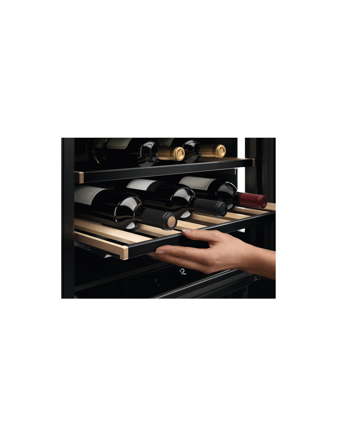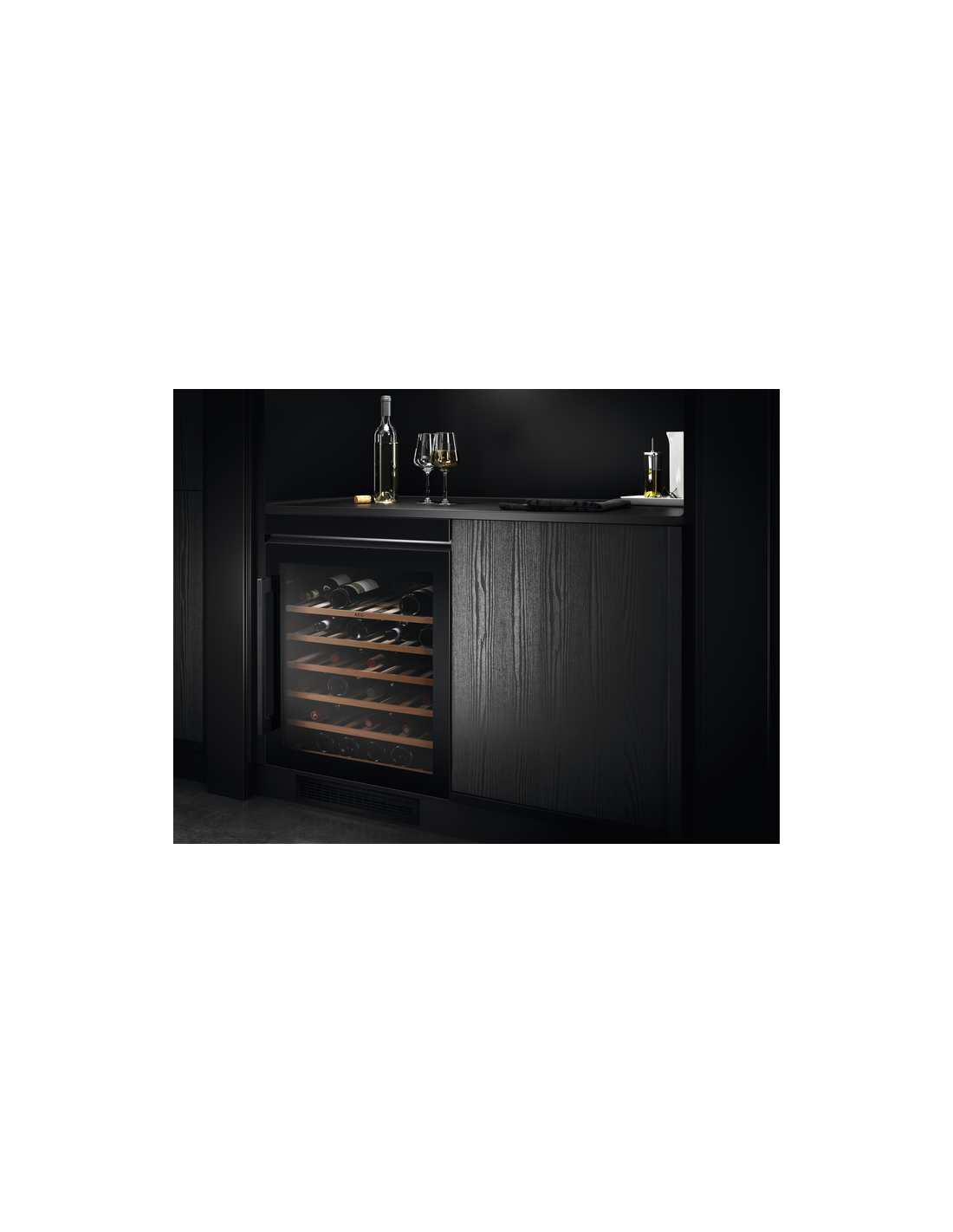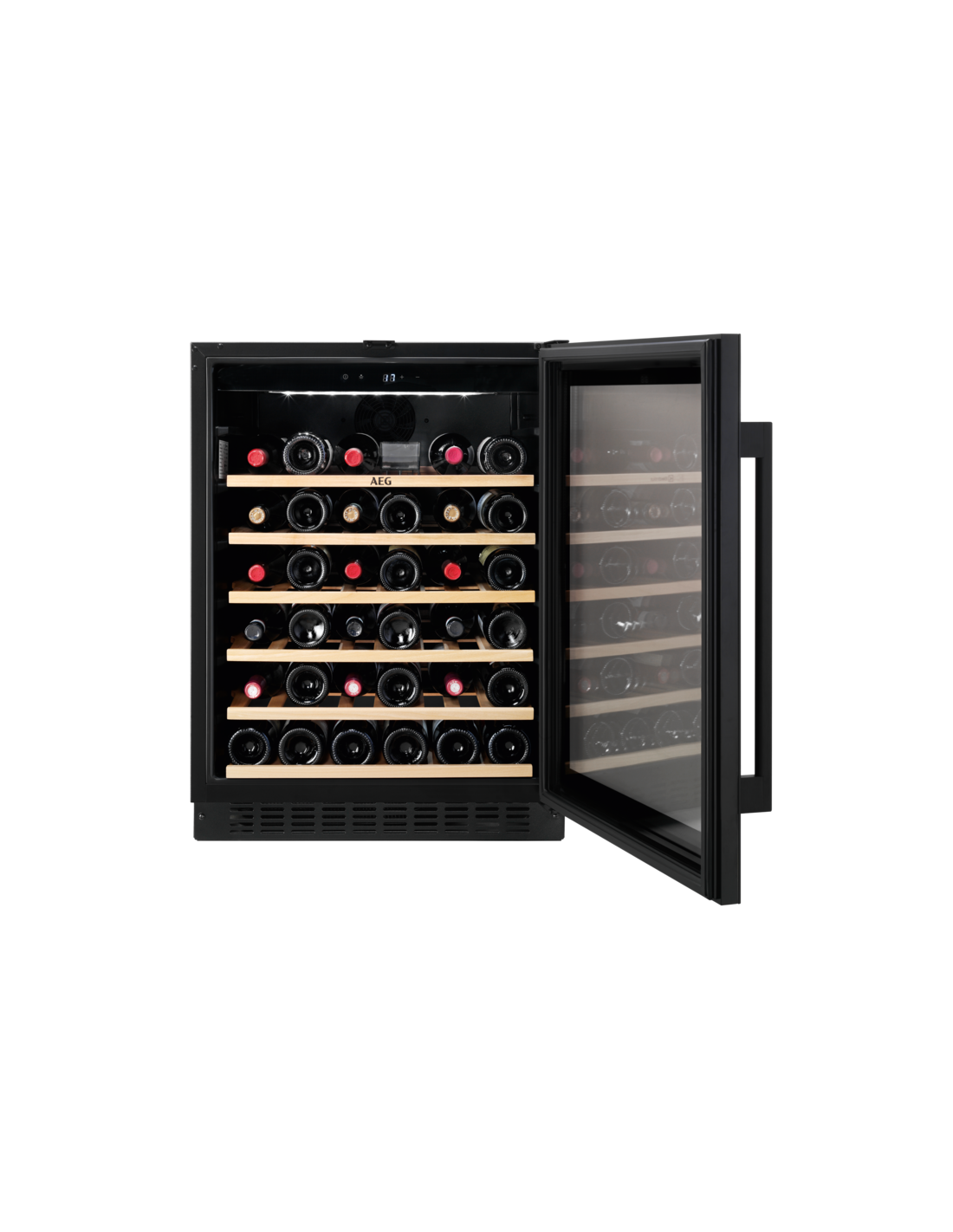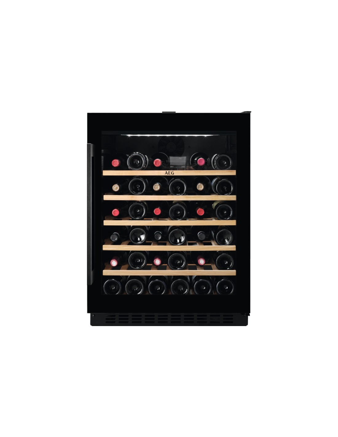 AEG AWS4052B5B. Posizionamento dell'apparecchio: Sottopiano, Colore struttura: Nero, Colore interno: Nero. Capacità bottiglie: 52 bottiglia/bottiglie, Tipo di prodotto: Cantinetta vino con compressore, Intervallo temperatura (zona 1): 5 - 18 °C. Tipo di display: LED, Lunghezza cavo: 1,8 m, Tipo di lampada: LED. Classe efficienza energetica: G, Consumo energetico annuo: 149 kWh, Scala di efficienza energetica: Da A a G. Larghezza: 595 mm, Profondità: 565 mm, Altezza: 820 mm