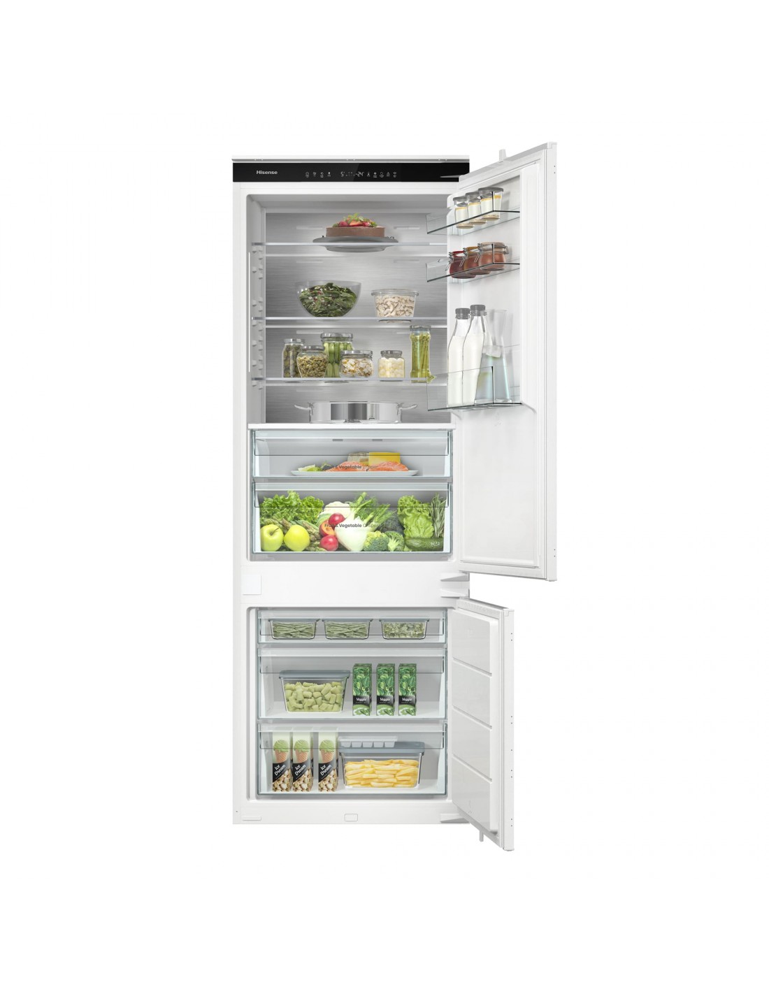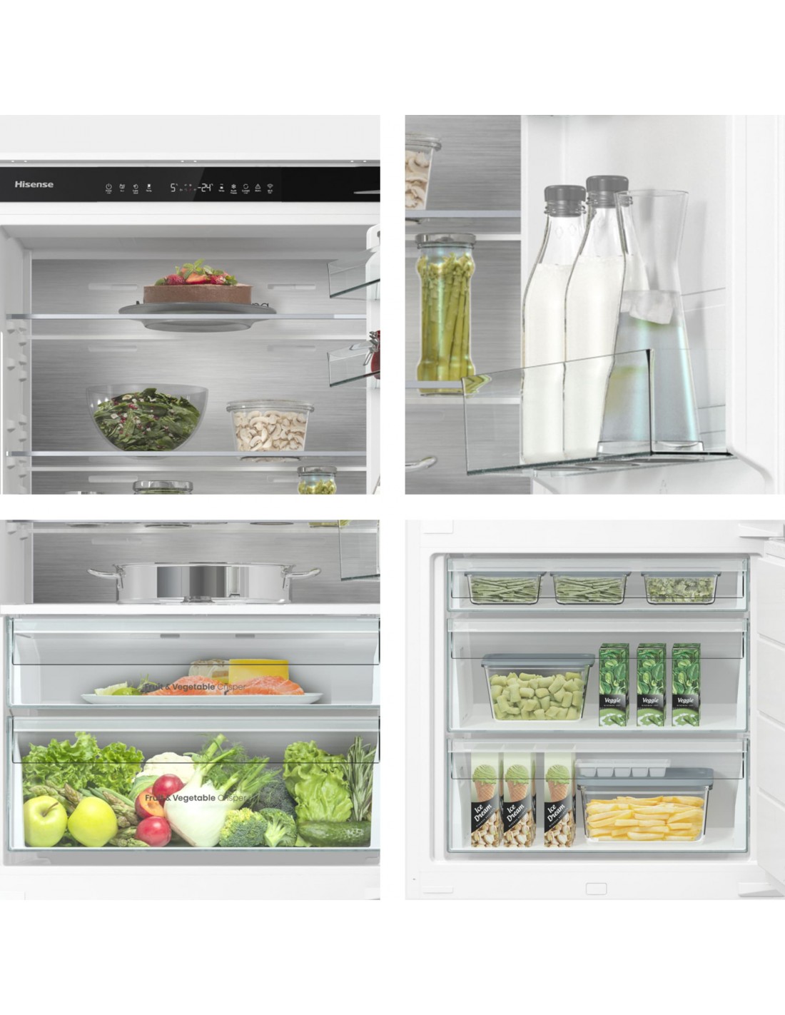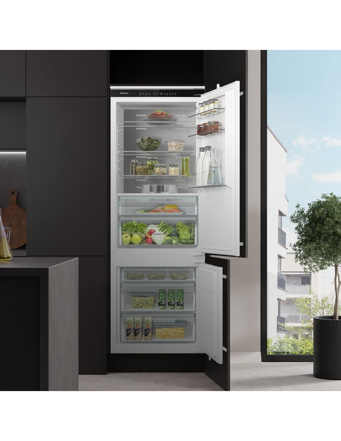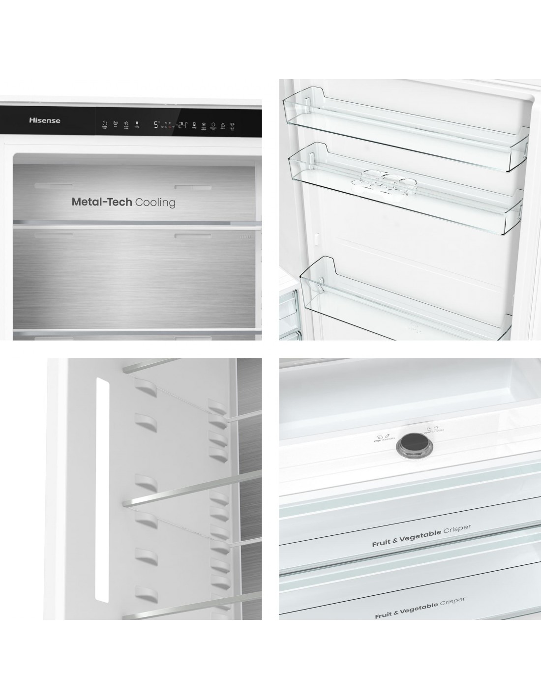Hisense RB3B370SAWD1. Capacità netta totale: 377 L, Classe climatica: SN-T, Emissione acustica: 35 dB. Capacità netta frigorifero: 273 L, No Frost (frigorifero), Sistema Multi-Airflow (frigorifero), Luce interna, Numero di ripiani frigorifero: 4. Capacità netta congelatore: 104 L, Capacità di congelamento: 6 kg/24h, No Frost (congelatore). Compartimento zona fresca. Classe efficienza energetica: D, Consumo energetico annuo: 210 kWh. Colore del prodotto: Bianco