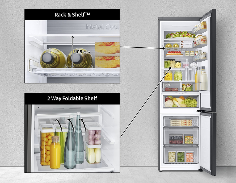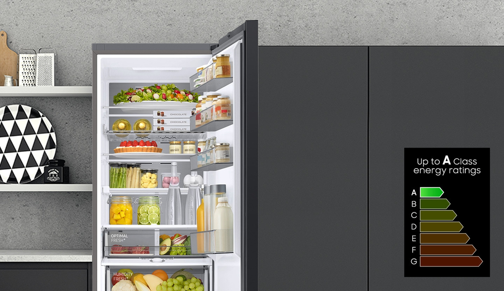 Questo frigorifero extra large da 390 litri* garantisce una capacità interna superiore con una profondità standard di 600 mm, allineandosi perfettamente con gli altri mobili della cucina. L’isolante a elevata efficienza della tecnologia SpaceMax™ consente di ridurre notevolmente lo spessore delle pareti, creando più spazio per la conservazione degli alimenti, senza antiestetiche sporgenze esterne. * Capacità dei modelli RB38A** con un'altezza di 2030 mm.