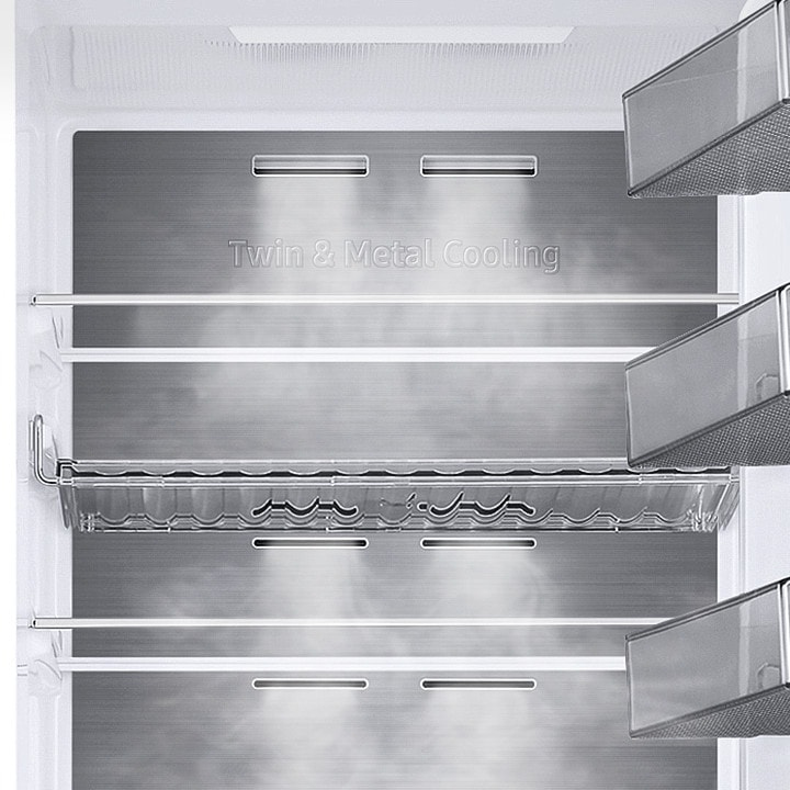 Assicurati che i tuoi cibi rimangano freschi, senza seccarsi, due volte più a lungo.Tramite un doppio sistema di refrigerazione con evaporatori e ventole separati, la tecnologia Twin Cooling System™ ottimizza la temperatura e l’umidità all’interno di freezer e frigorifero. Gli alimenti vengono così conservati in condizioni ottimali, preservandone il sapore naturale e gli aromi ed evitando commistioni di odori. * Umidità media del frigorifero. Dati interni.