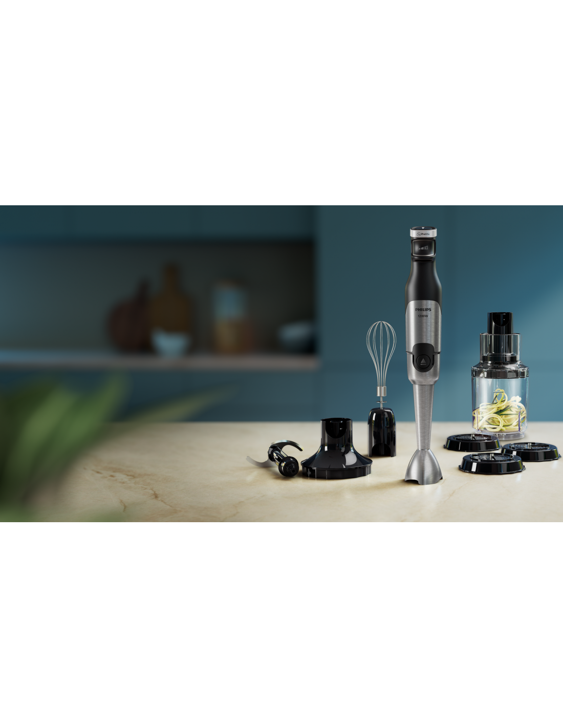 Con il 50% di potenza in più* per tritare qualsiasi ingrediente, il frullatore a immersione Philips Serie 5000 è la scelta perfetta per ottenere risultati eccellenti e uniformi. Gusta zuppe cremose e salse vellutate, esplorando nuovi modi di preparare i tuoi piatti preferiti!