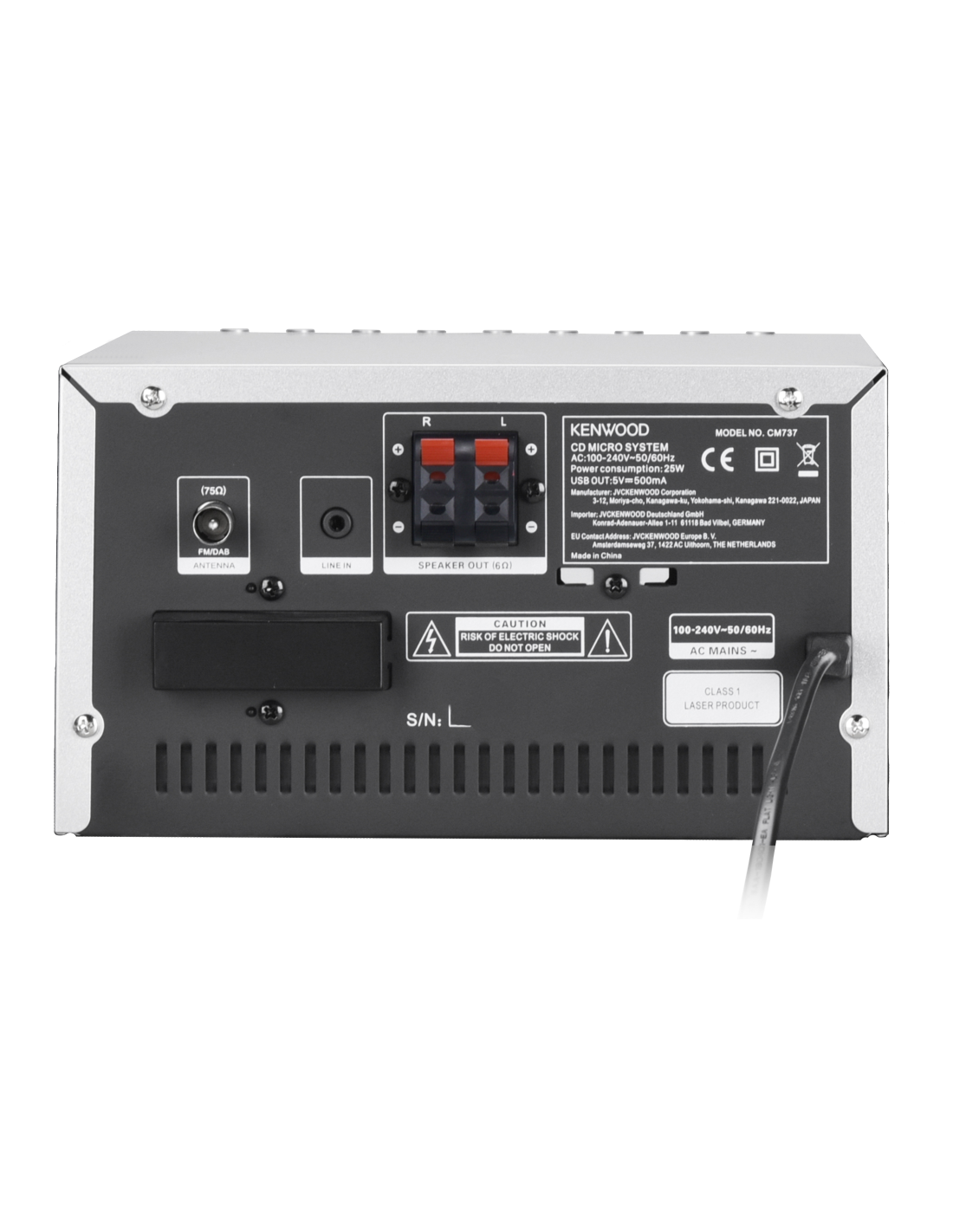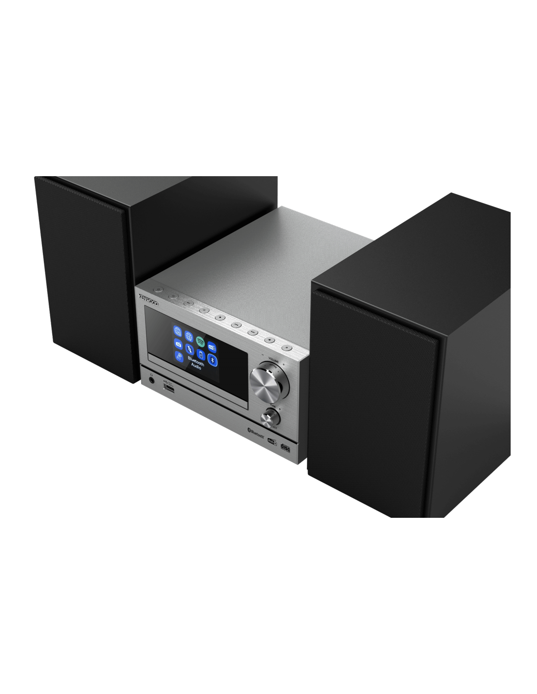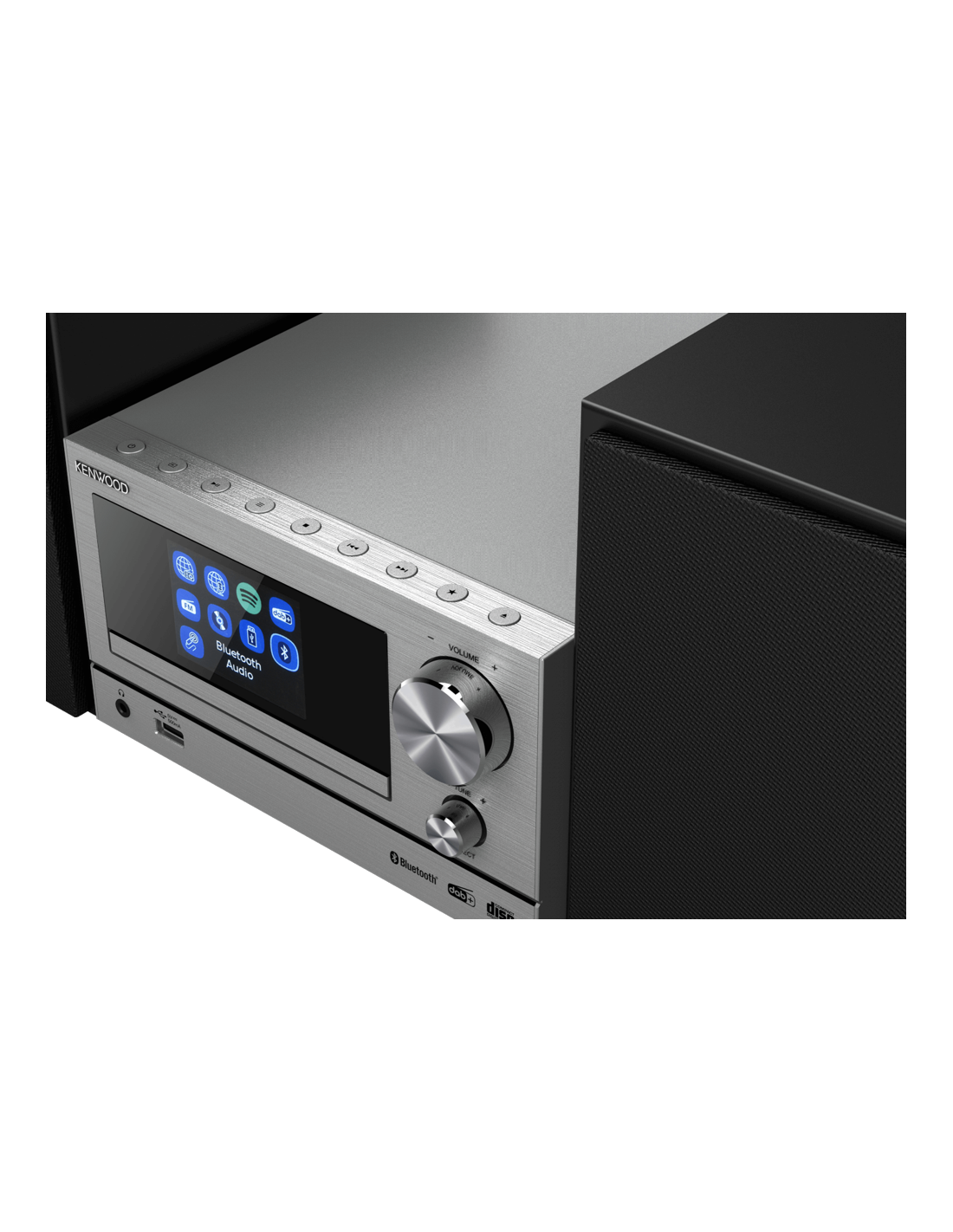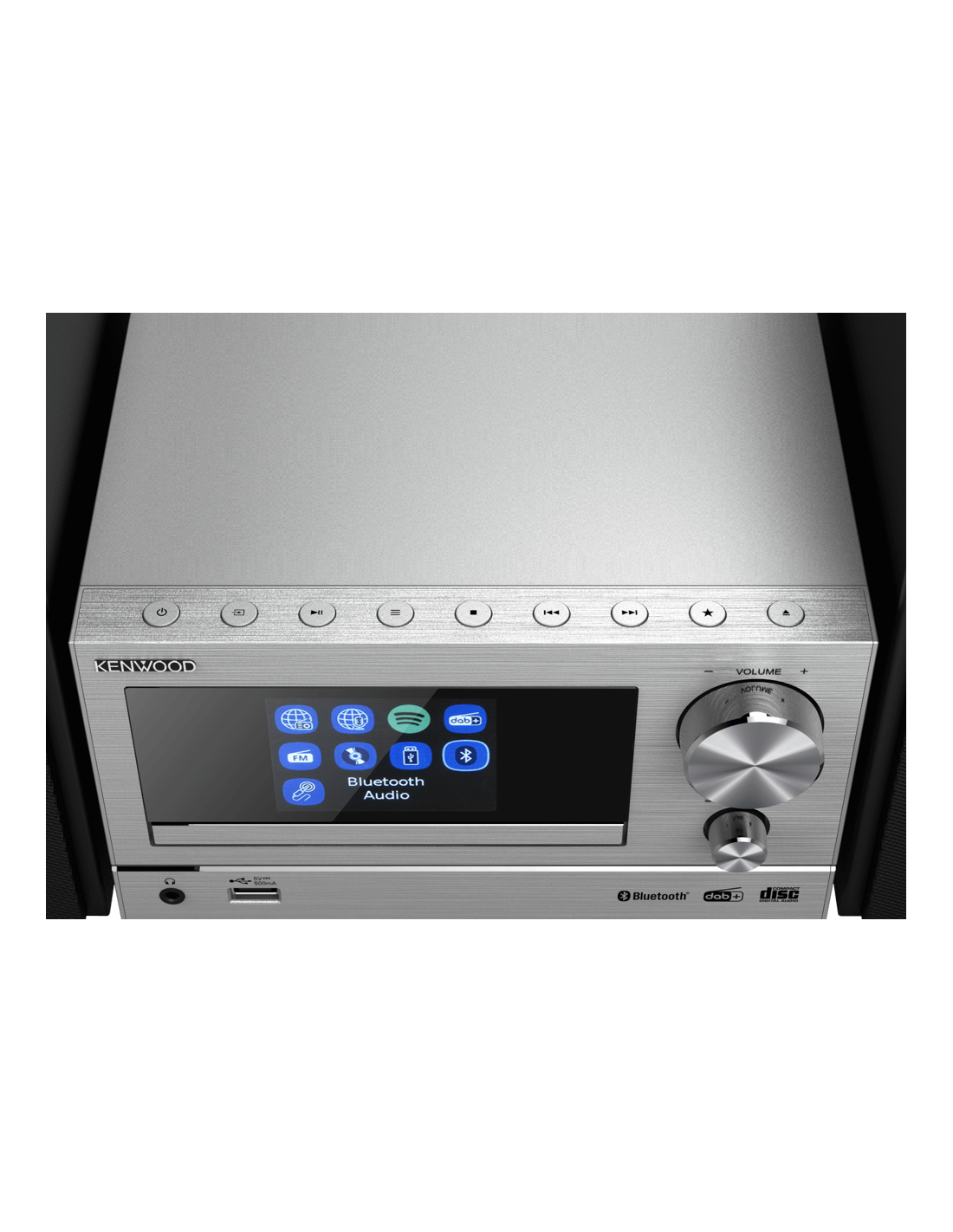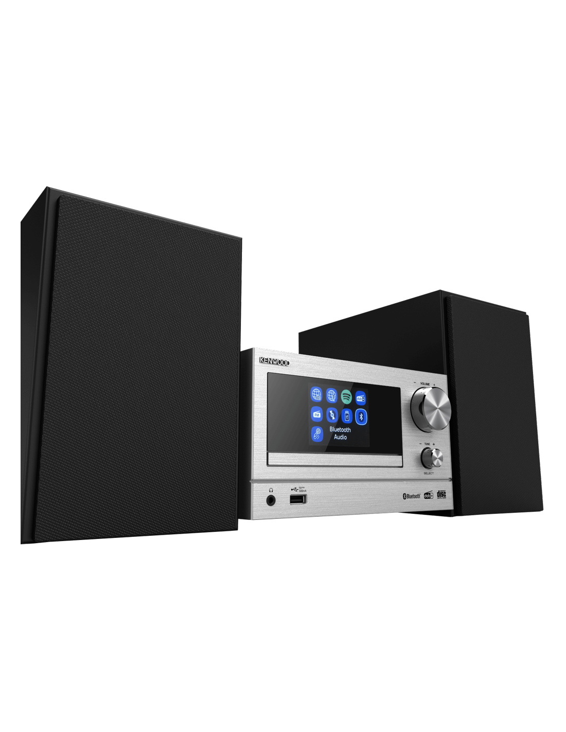 Kenwood M-7000S. Tipo: Mini impianto audio domestico, Colore del prodotto: Argento, Numero di dischi ottici: 1 dischi. Potenza in uscita (RMS): 30 W, Tipo di speaker: 2-vie, Impedenza: 6 Ω. Bande del sintonizzatore: DAB+, FM, Banda FM: 87,5 - 108 MHz, Servizi radio Internet supportati: Spotify. Tipo di display: TFT, Colore retroilluminazione: Multicolore. Formati audio supportati: MP3, MP3 VBR, CBR