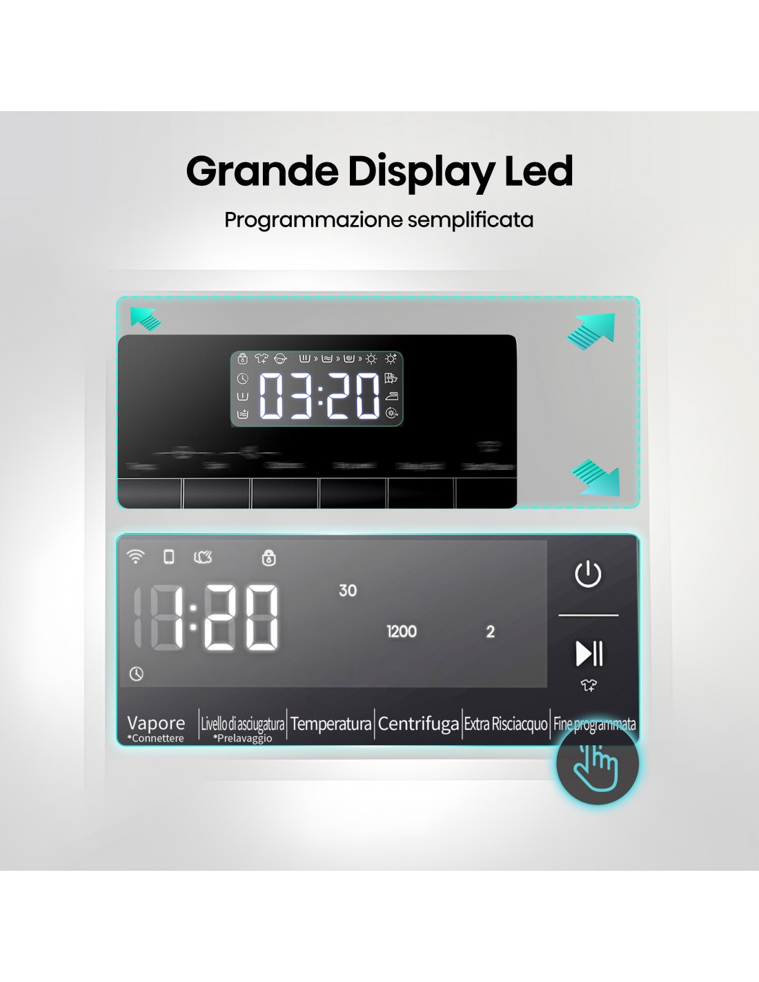 L'elegante display LED offre una panoramica molto semplice ed esteticamente gradevole del tuo elettrodomestico. Il display luminoso, delicato ma chiaro, ti impedisce di selezionare accidentalmente le funzioni sbagliate e ti offre una panoramica chiara e di facile lettura dei tuoi programmi preferiti.