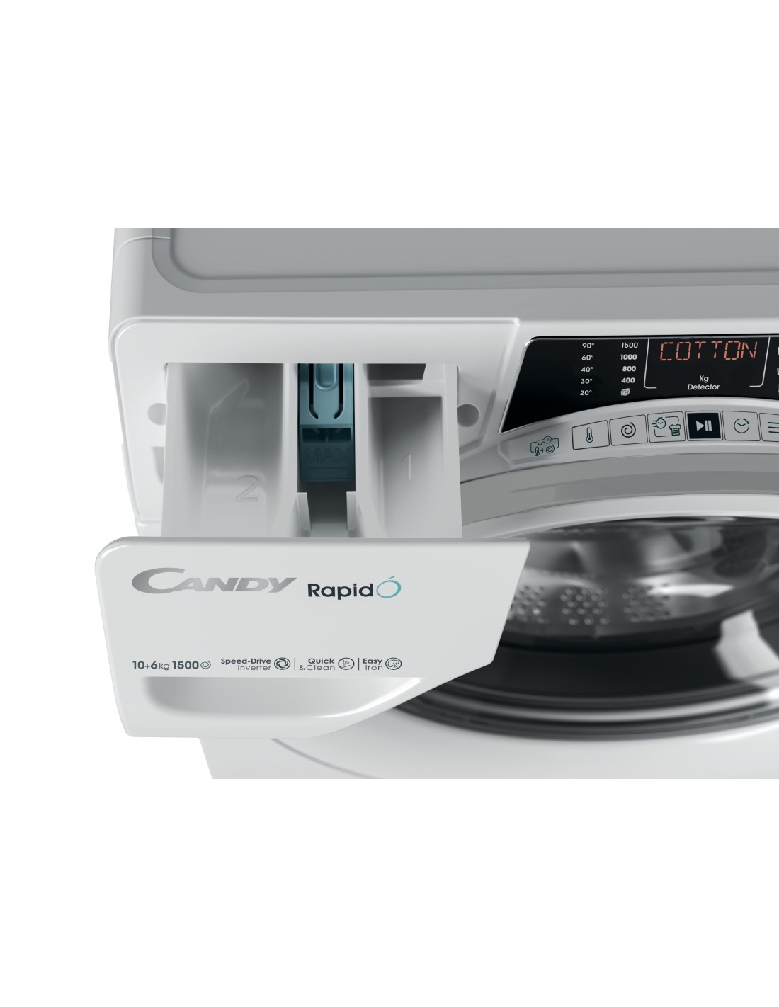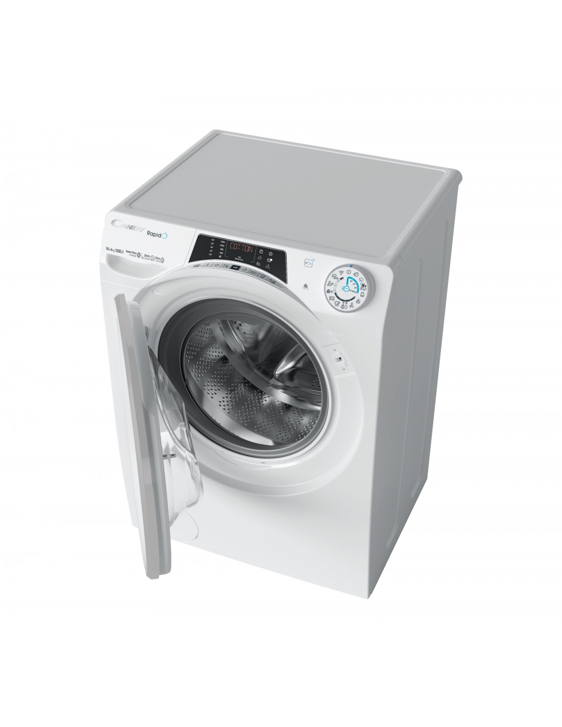 Candy RapidÓ ROW51066DWMST-S. Tipo di carica: Caricamento frontale, Posizionamento dell'apparecchio: Libera installazione, Colore del prodotto: Bianco. Capacità di asciugatura: 6 kg, Velocità di centrifuga massima: 1500 Giri/min, Classe di efficienza della centrifuga: B. Classe di efficienza energetica (lavaggio): A, Classe di efficienza energetica( lavaggio e asciugatura): D, Consumo di acqua (lavaggio): 51 L. Profondità: 580 mm, Larghezza: 600 mm, Altezza: 850 mm