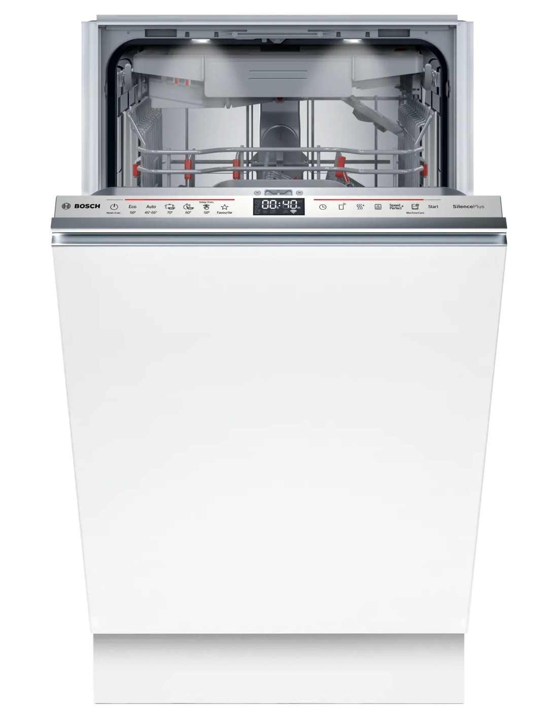Bosch Serie 6 SPV6EMX09E. Posizionamento dell'apparecchio: A scomparsa totale, Dimensione: Compatta (45 cm), Colore pannello di controllo: Acciaio inox. Numero di coperti: 10 coperti, Classe emissione rumore: B, Emissione acustica: 44 dB. Regolazione piedini: 6 cm, Applicazioni per il controllo supportate: Home Connect, Funzioni delle app: Remote diagnostics, Monitoraggio remoto. Classe efficienza energetica: B, Consumo di acqua per ciclo: 8,7 L, Consumo energetico per 100 cicli: 51 kWh. Larghezza: 448 mm, Profondità: 550 mm, Altezza: 815 mm