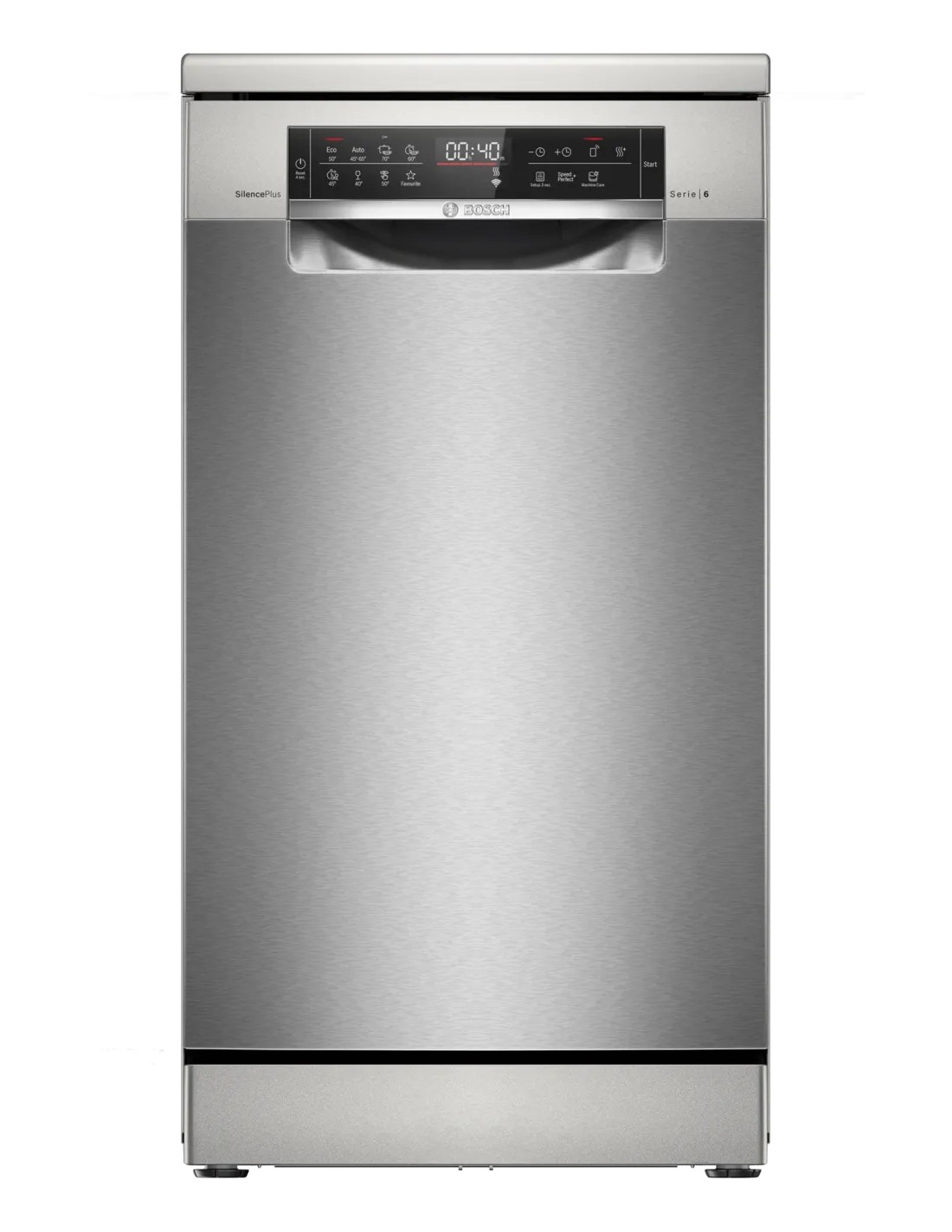Bosch Serie 6 SPS6EMI21E. Posizionamento dell'apparecchio: Libera installazione, Dimensione: Compatta (45 cm), Colore della porta: Acciaio spazzolato. Numero di coperti: 10 coperti, Classe emissione rumore: B, Emissione acustica: 44 dB. Regolazione piedini: 2 cm, Applicazioni per il controllo supportate: Home Connect, Funzioni delle app: Remote diagnostics, Monitoraggio remoto. Classe efficienza energetica: B, Consumo di acqua per ciclo: 8,7 L, Consumo energetico per 100 cicli: 51 kWh. Larghezza: 450 mm, Profondità: 600 mm, Altezza: 845 mm