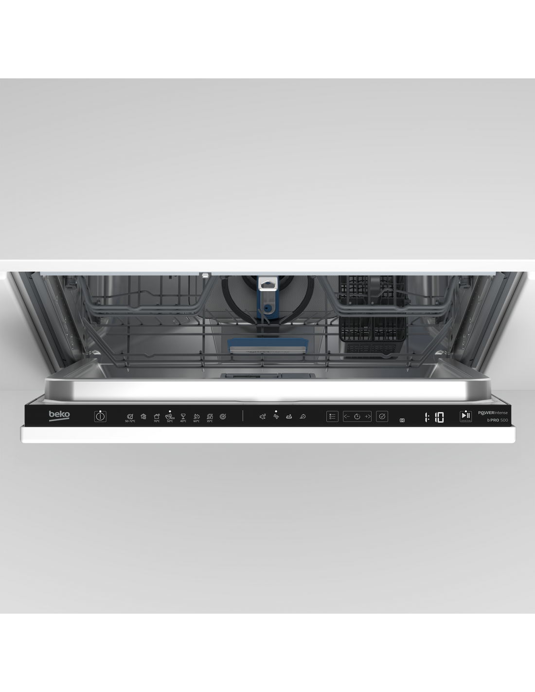 Beko b300 BDIN38561P: Lavastoviglie a Scomparsa Totale Classe A, 60 cm, 15 Coperti. Posizionamento dell'apparecchio: A scomparsa totale, Dimensione: Dimensione massima (60 cm), Colore pannello di controllo: Nero. Numero di coperti: 15 coperti, Classe emissione rumore: B, Emissione acustica: 41 dB. Classe efficienza energetica: A, Consumo di acqua per ciclo: 8,9 L, Consumo energetico per 100 cicli: 55 kWh. Larghezza: 598 mm, Profondità: 550 mm, Altezza: 818 mm. Tecnologie Beko (lavaggio stoviglie): Fast+, SilentWash, TrayWash™ System, SelfDry, SteamGloss®, SensorAdapt, AquaFlex®, Flexible 3rd Rack