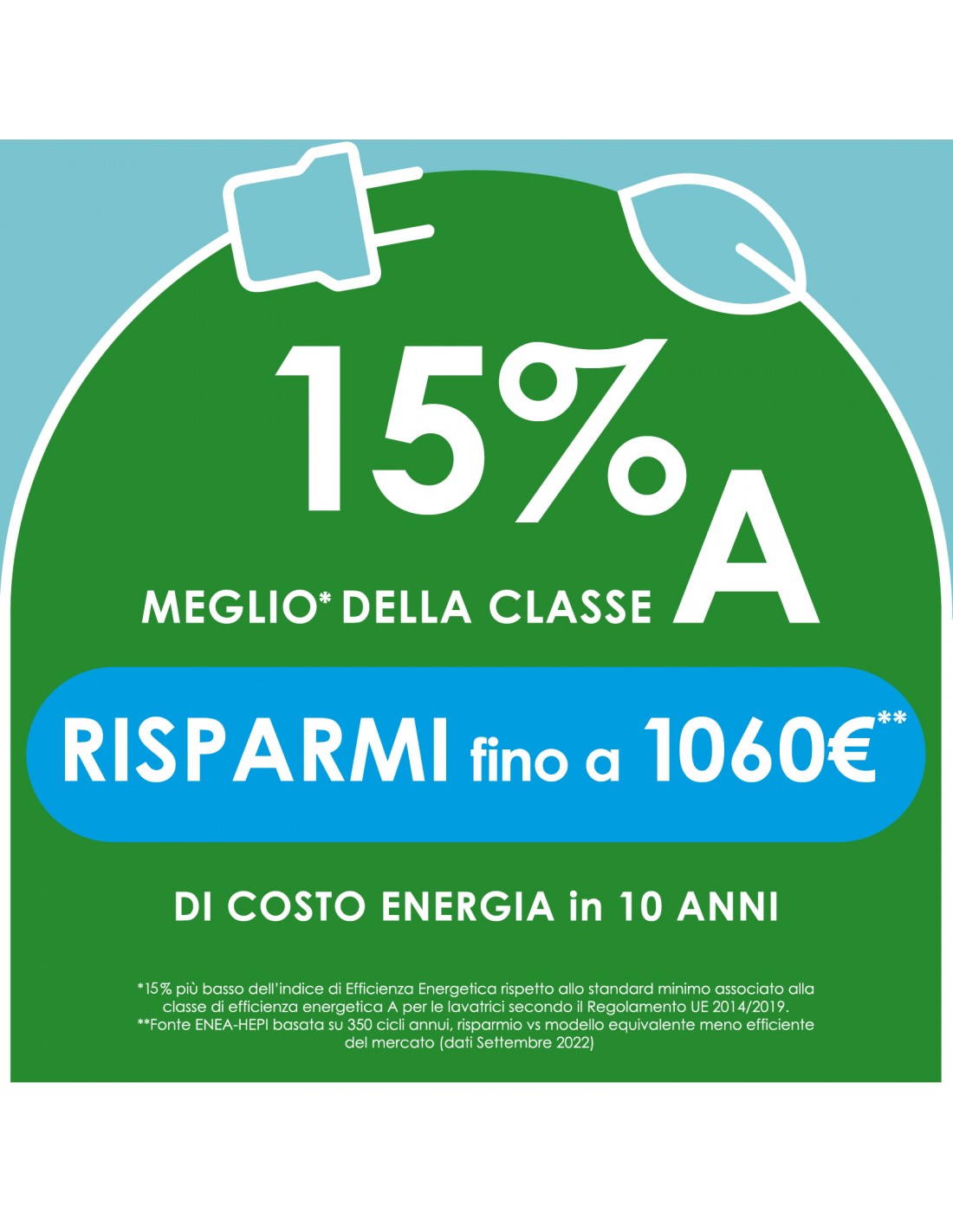 Grazie al ridotto consumo energetico, RapidÓ è il 15% più efficiente di una lavatrice standard in classe A.