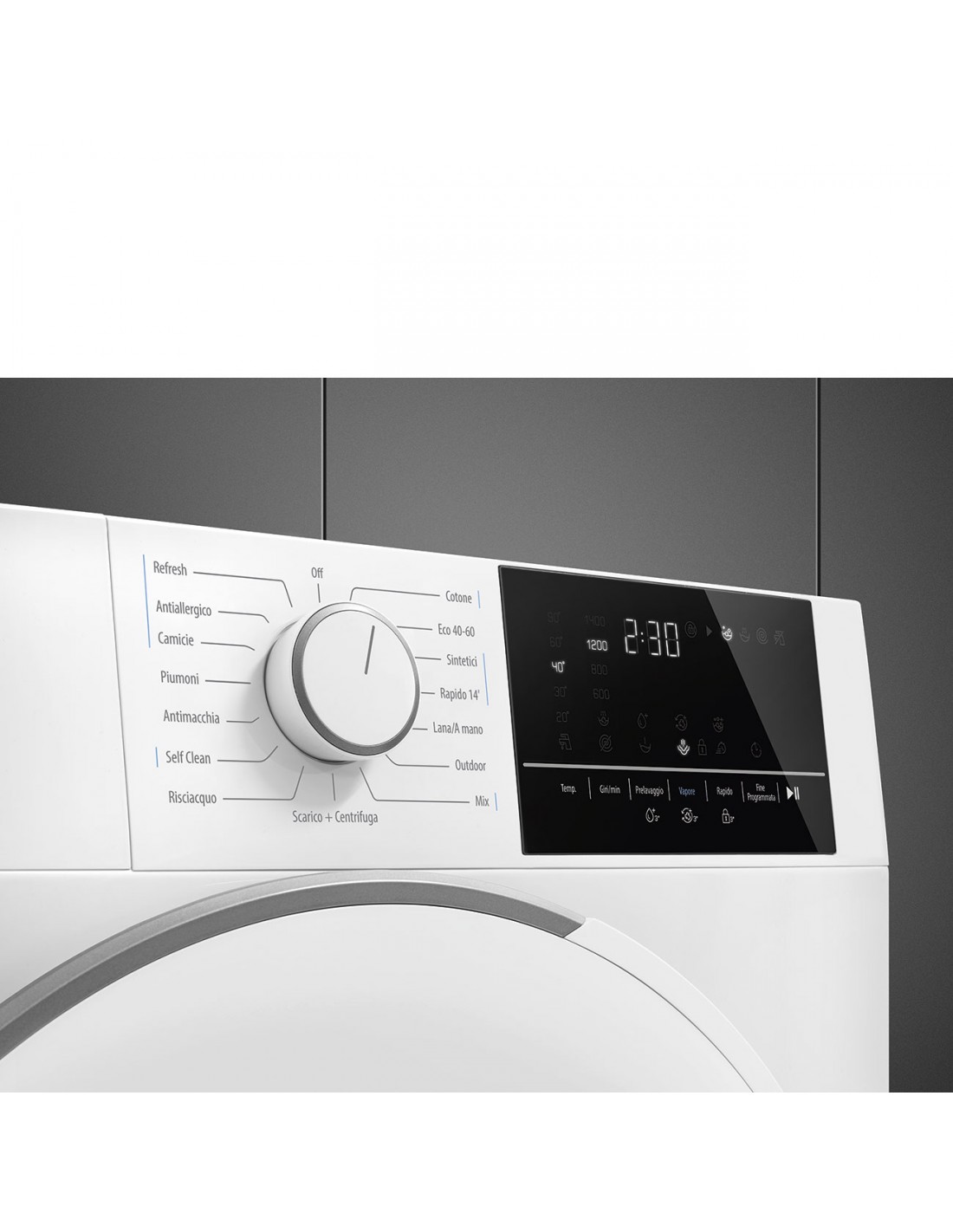 Smeg WN04SEA1. Tipo di carica: Caricamento frontale. Capacità cestello: 10 kg, Classe di efficienza della centrifuga: B, Silenziosità (centrifuga): 75 dB, Velocità di centrifuga massima: 1400 Giri/min. Colore del prodotto: Bianco. Larghezza: 600 mm, Profondità: 580 mm, Altezza: 840 mm. Classe efficienza energetica: A