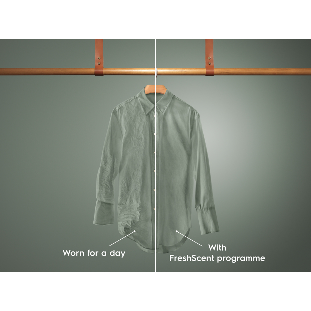 Il piacere di indossare capi che sanno di fresco pulito con un consumo d’acqua notevolmente ridotto. Rinfrescando i tuoi capi con il vapore, puoi neutralizzare gli odori[3] e ridurre le pieghe in 25 minuti. Per una maggiore freschezza, aggiungi la nostra fragranza per vapore al programma FreshScent.