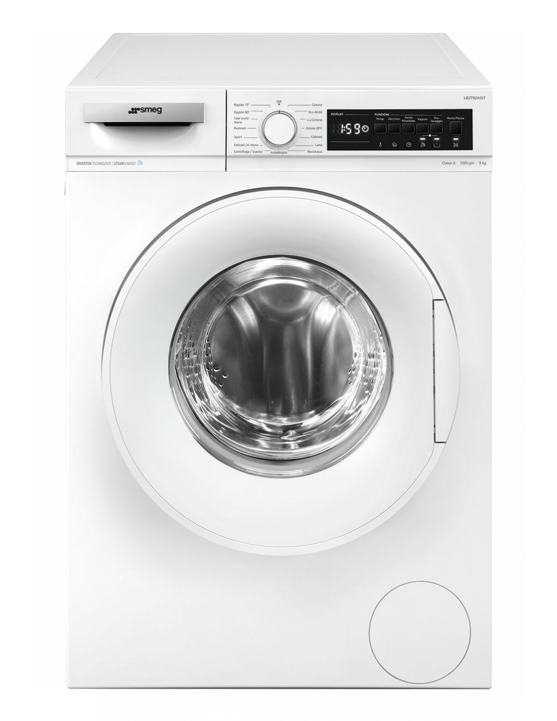 Smeg LB2T92ASIT. Tipo di carica: Caricamento frontale. Capacità cestello: 9 kg, Classe di efficienza della centrifuga: B, Silenziosità (centrifuga): 76 dB. Colore del prodotto: Bianco. Larghezza: 597 mm, Profondità: 582 mm, Altezza: 845 mm. Classe efficienza energetica: A