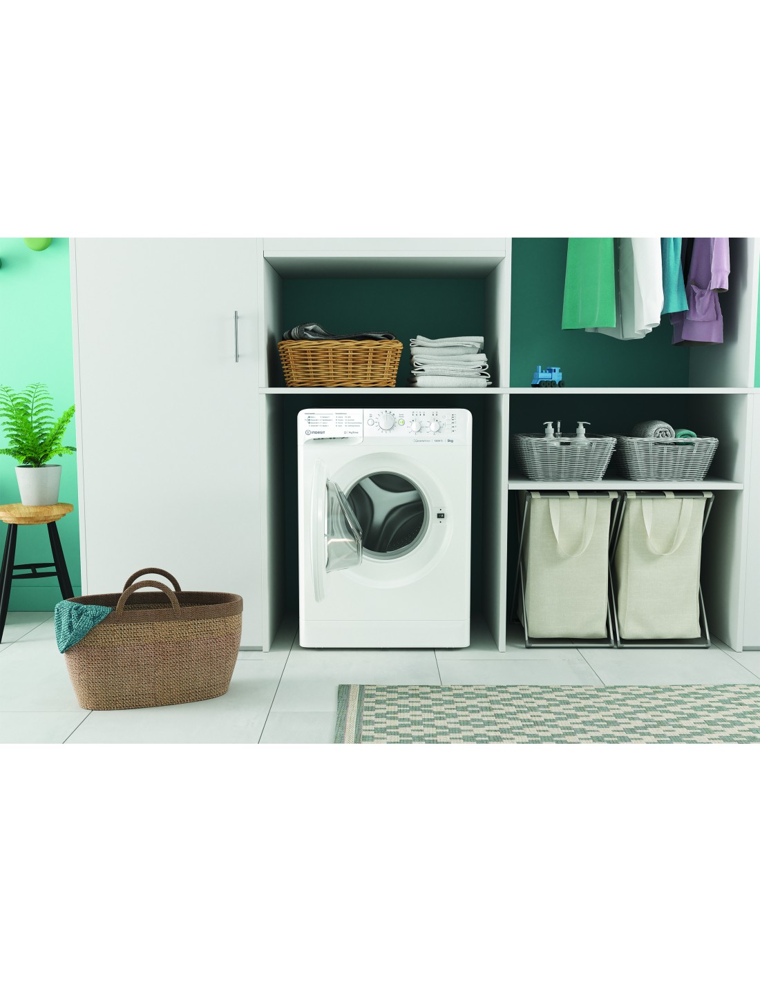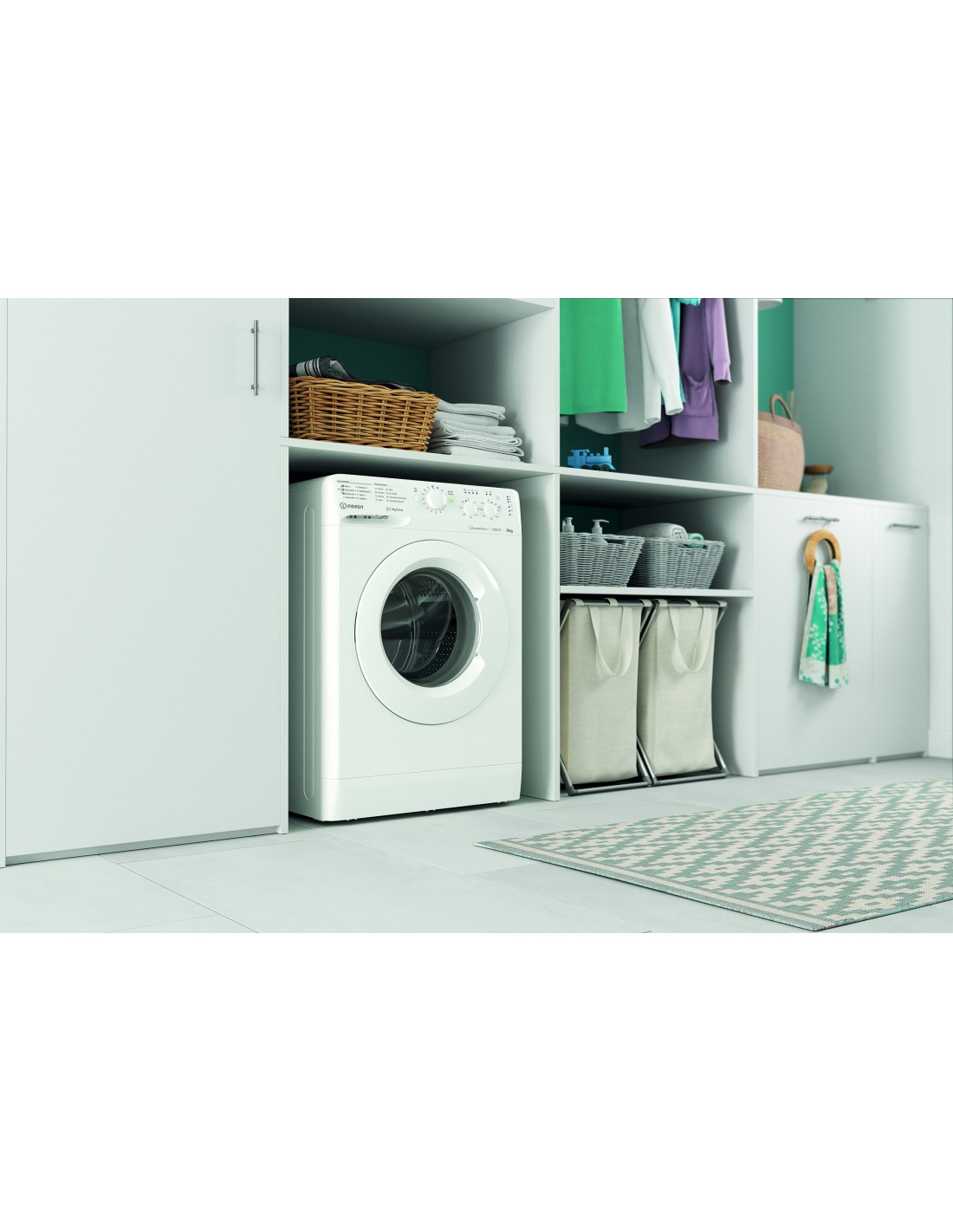 Caratteristiche di questa lavatrice a carica frontale a libera installazione Indesit: cestello spazioso da 9,0 kg. Classe energetica A. Centrifuga a 1200 giri al minuto, rapida ed efficiente. Colore bianco.