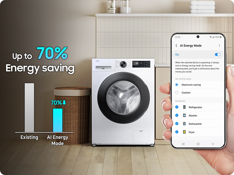 Monitora e riduci i consumi energetici della tua lavatrice. Grazie alla modalità AI Energy[12] , potrai monitorare i consumi energetici e prevedere l'importo in bolletta. Con i programmi che utilizzano la modalità AI Energy[13] , potrai ridurre i consumi energetici fino al 70%[14] : la tecnologia Ecobubble™ di Samsung offre le stesse prestazioni pur lavando a temperature più basse e adattando la durata del ciclo.