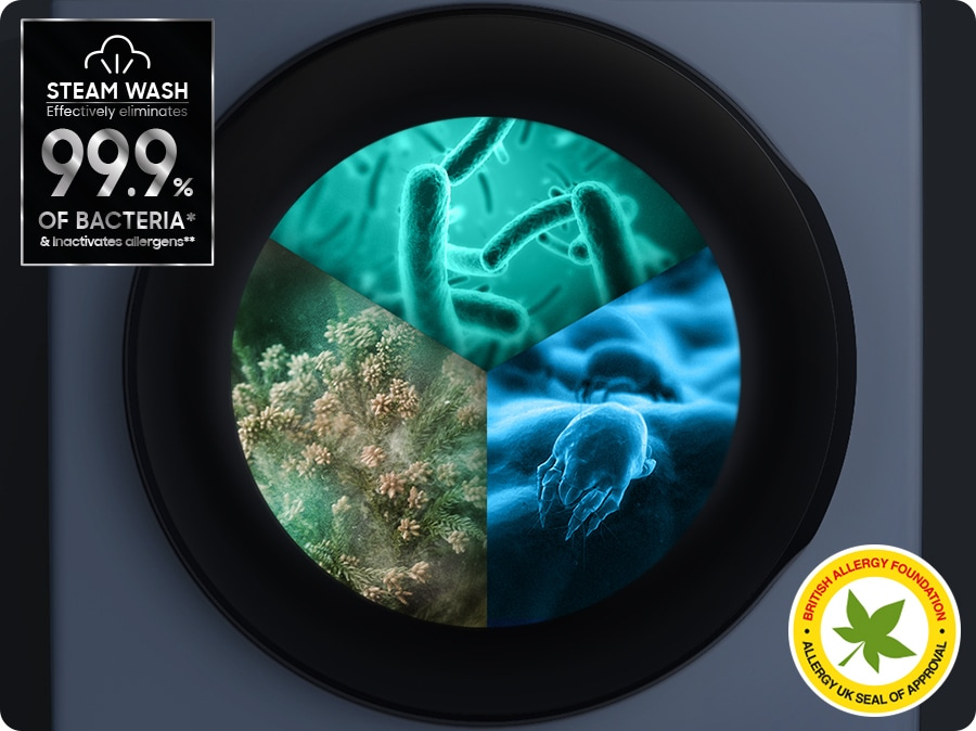 Dona ai tuoi capi una pulizia igienica e profonda. Questa funzione rilascia vapore dal fondo del tamburo, aiutandoti a rimuovere ogni traccia di sporco e il 99,9% di alcuni batteri[15] e inattivando gli allergeni presenti negli acari della polvere in casa[16]. Il ciclo della funzione Vapore igienizzante riduce l'esposizione ad acari della polvere, peli di cane e gatto, pollini e funghi[17].
