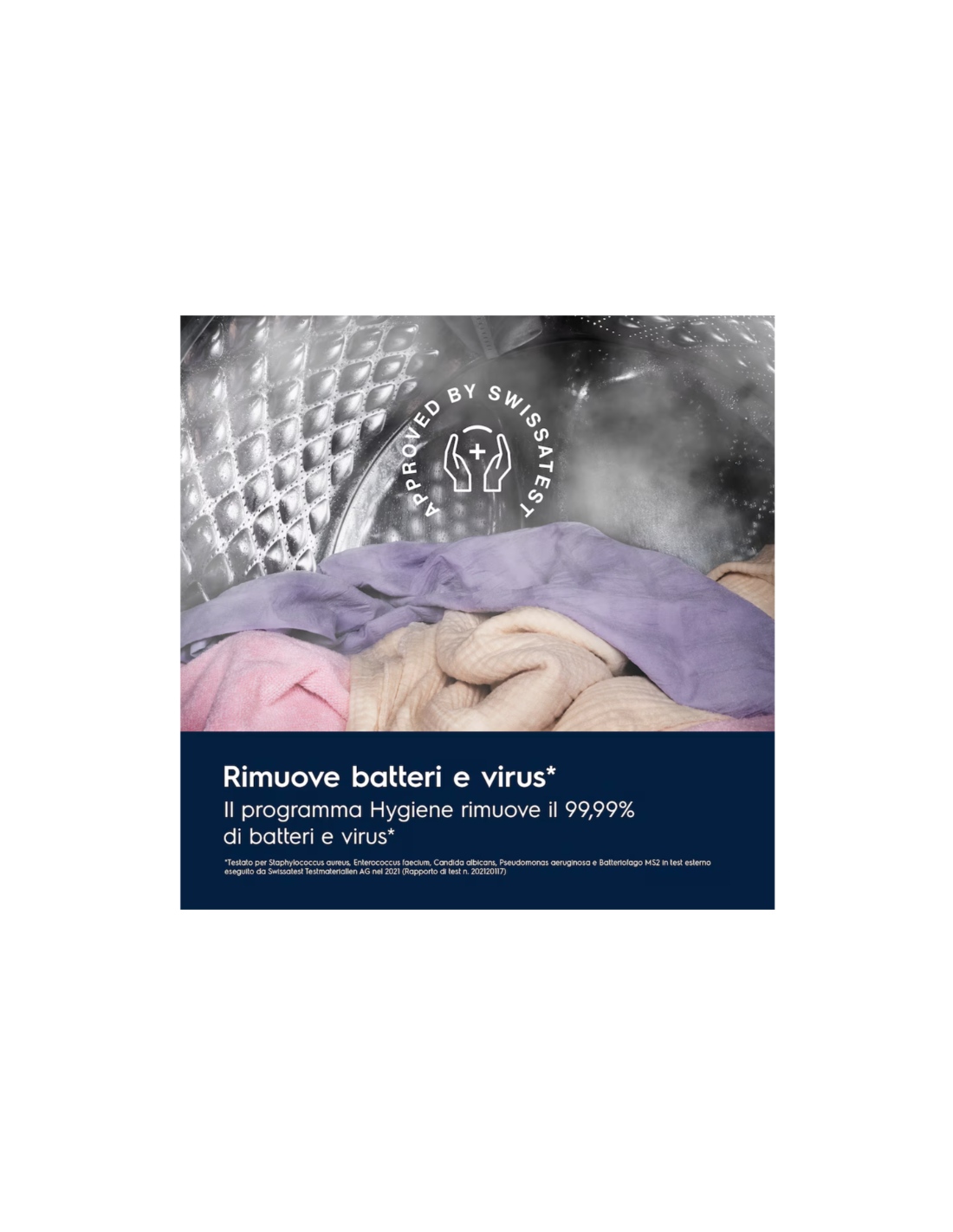 Il programma Hygiene, certificato da Swissatest, combina il vapore al ciclo di lavaggio per rimuovere più del 99,99% di batteri e virus[1] sopra i 60 º C. Polline e allergeni sono ridotti per una pulizia igienica dopo ogni lavaggio.