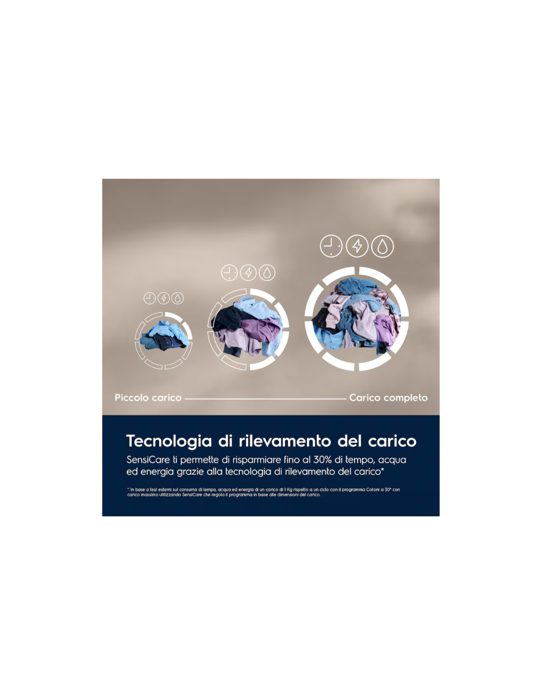 SensiCare è la tecnologia che rileva le dimensioni del carico e regola il programma per risparmiare fino al 30% di tempo, acqua ed energia[2]. Questo garantisce un lavaggio preciso e su misura per ogni capo.