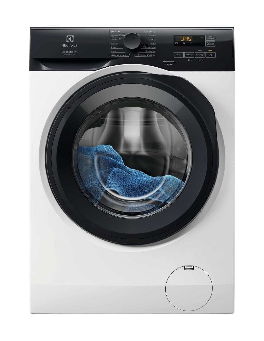 Programma FullWash45': lava a 30º in soli 45 minuti, anche a pieno carico. È ideale per carichi leggermente sporchi, capi di tutti i giorno, tessuti misti e cotoni colorati.
