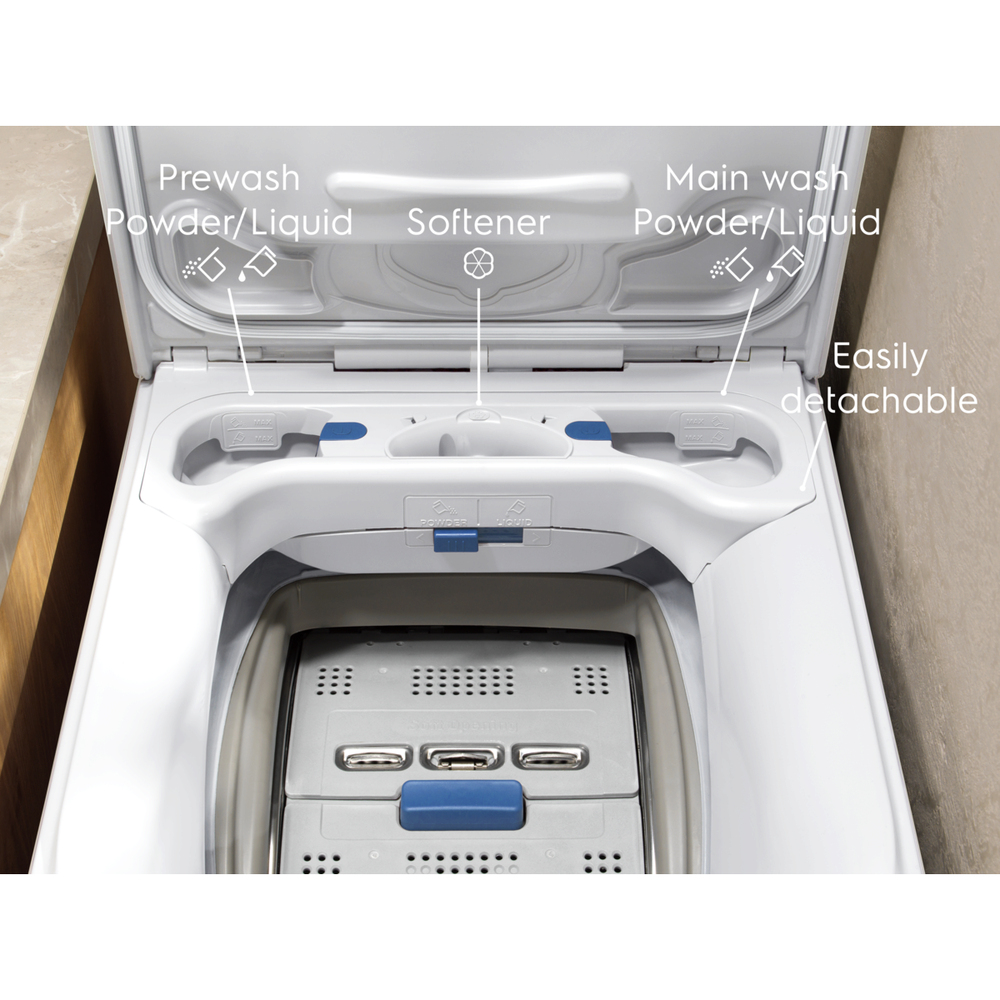 Il cassetto FlexiDose Plus permette di usare con facilità detersivo in polvere e liquido, distribuendolo sempre al momento giusto. Anche con partenza ritardata, per proteggere al meglio i tuoi capi. Posizionato sul retro dell’apertura superiore, è semplice da usare e facile da rimuovere e pulire.