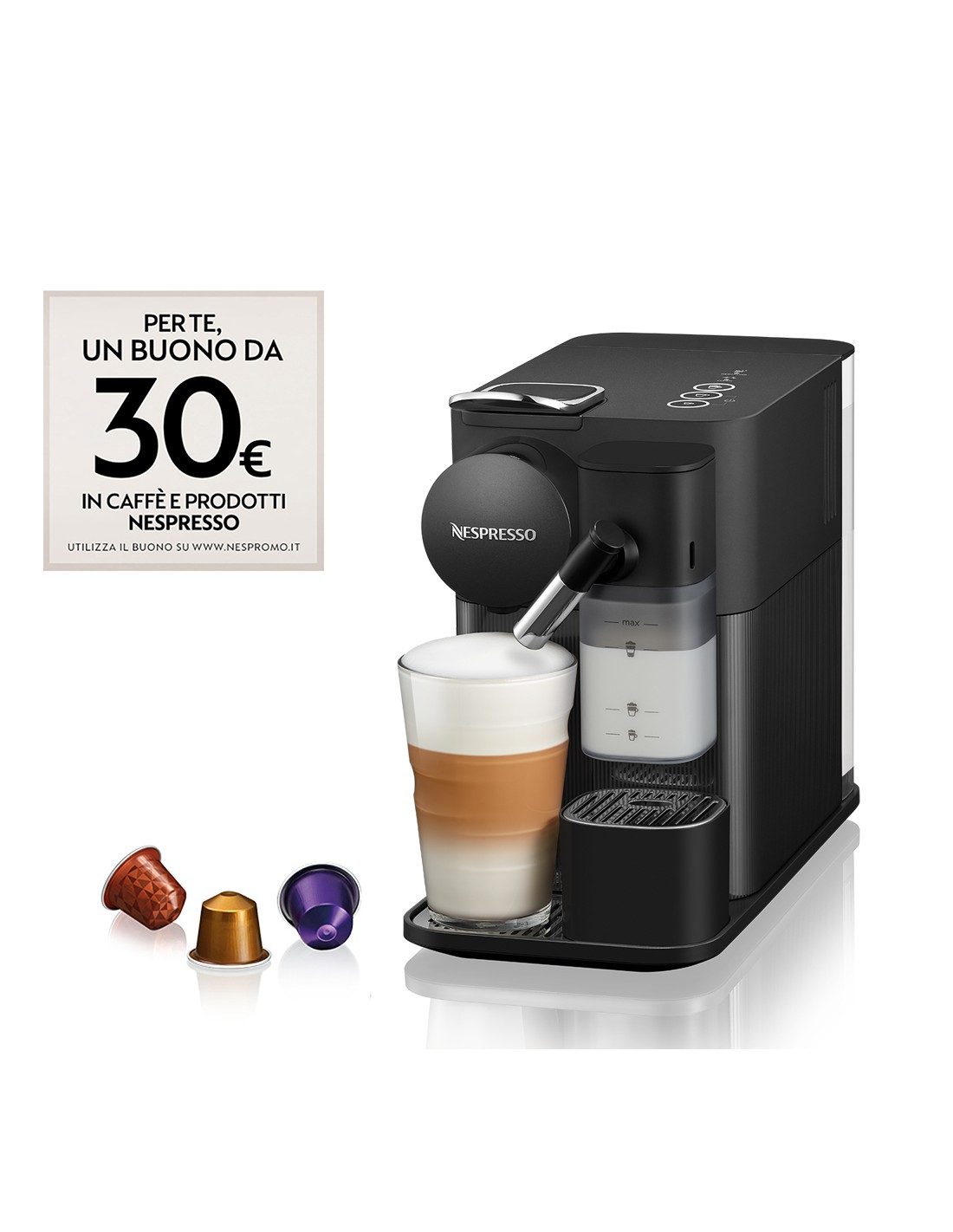 De’Longhi Lattissima One Nespresso. Tipo di prodotto: Macchina per espresso, Tipologia macchina del caffé: Automatica, Capacità tanica acqua: 1 L, Tipologia di caffè utilizzato: Capsule caffè, Vaschetta per caffè preparato: Tazza, Capacità in tazze: 1 tazze. Potenza: 1450 W. Colore del prodotto: Nero, Acciaio inossidabile
