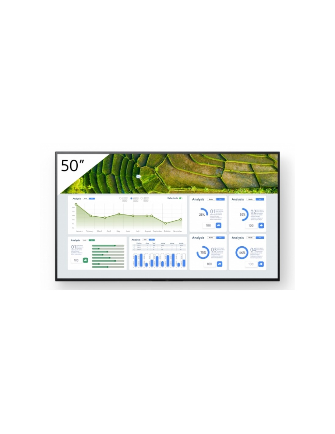 Sony FW-50BZ30L. Design del prodotto: Pannello piatto per segnaletica digitale. Dimensioni schermo: 127 cm (50"), Tecnologia display: LCD, Risoluzione del display: 3840 x 2160 Pixel, Luminosità schermo: 440 cd/m², Tipologia HD: 4K Ultra HD. Wi-Fi. Ore di servizio (ore/giorni): 24/7. Sistema operativo incluso: Android. Colore del prodotto: Nero