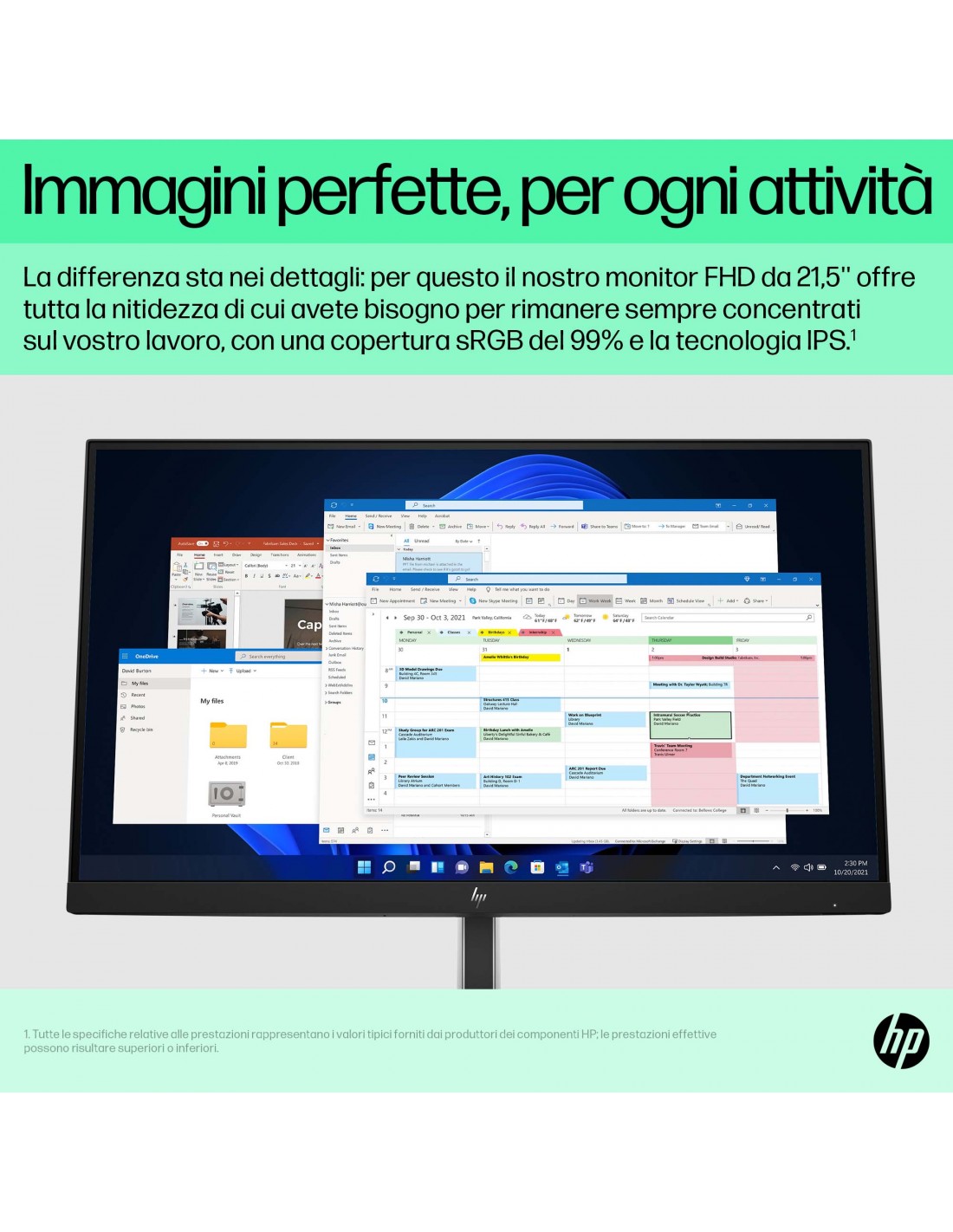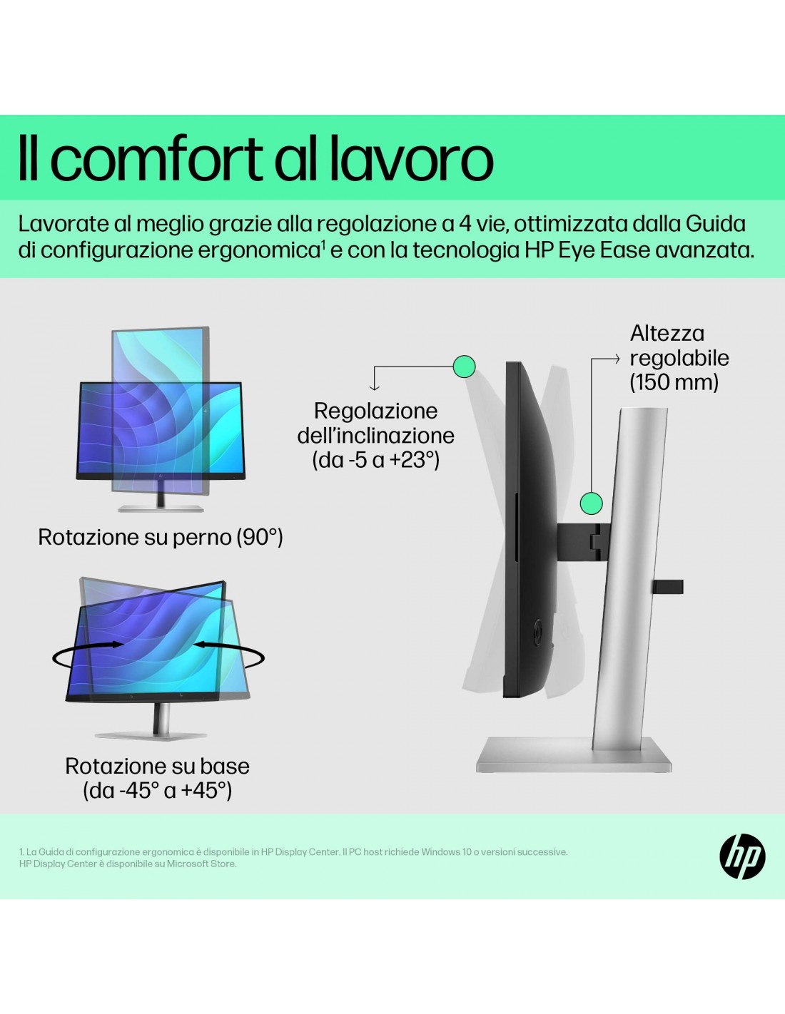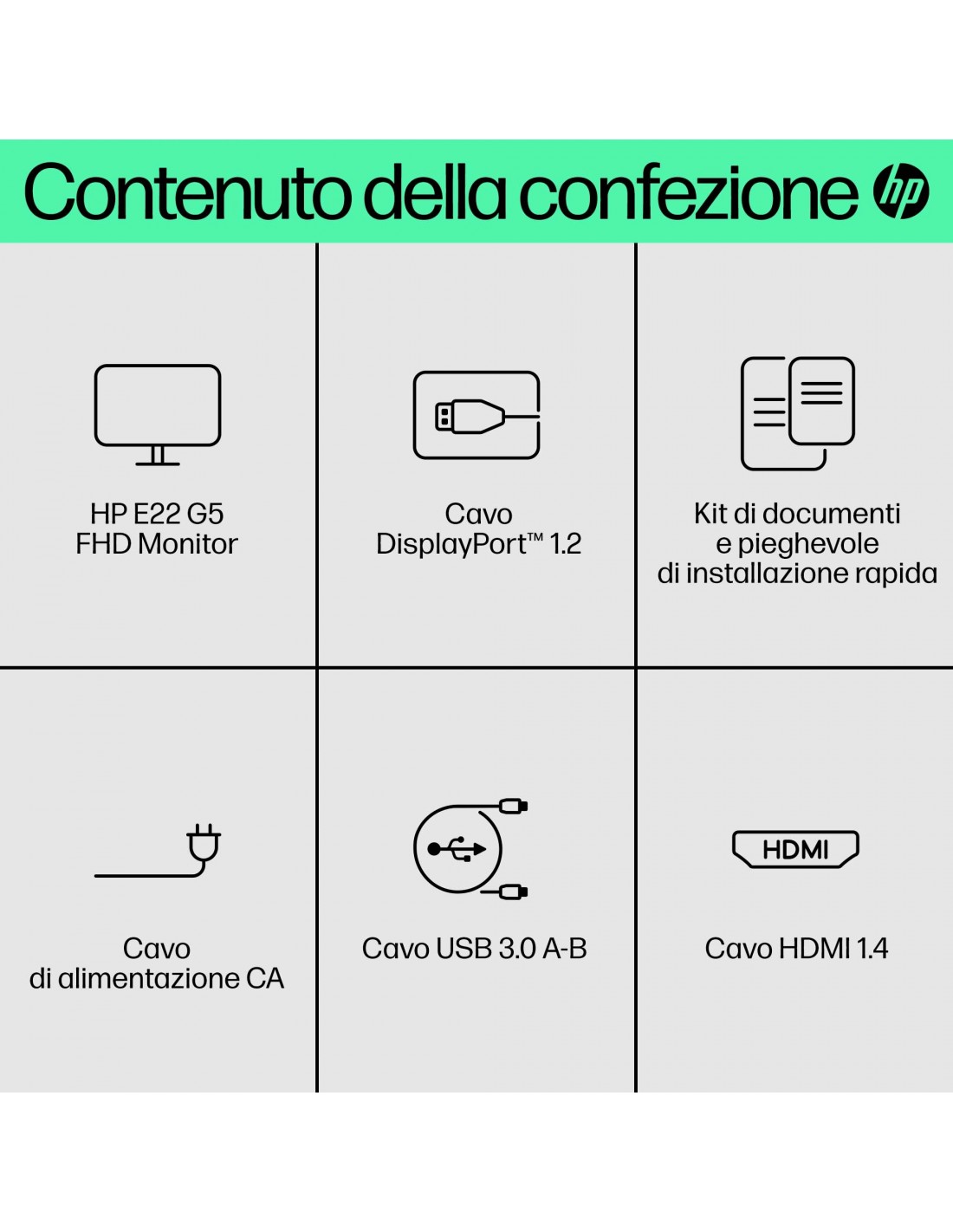 Realizzato appositamente per offrire immagini nitide, opzioni personalizzate per la massima comodità e autentica flessibilità, il monitor HP E22 G5 FHD ridefinisce il concetto di comfort, in modo che possiate lavorare al meglio senza ostacoli. Un display dallo stile elegante, progettato pensando all'ambiente, perfetto sia in ufficio che in casa.