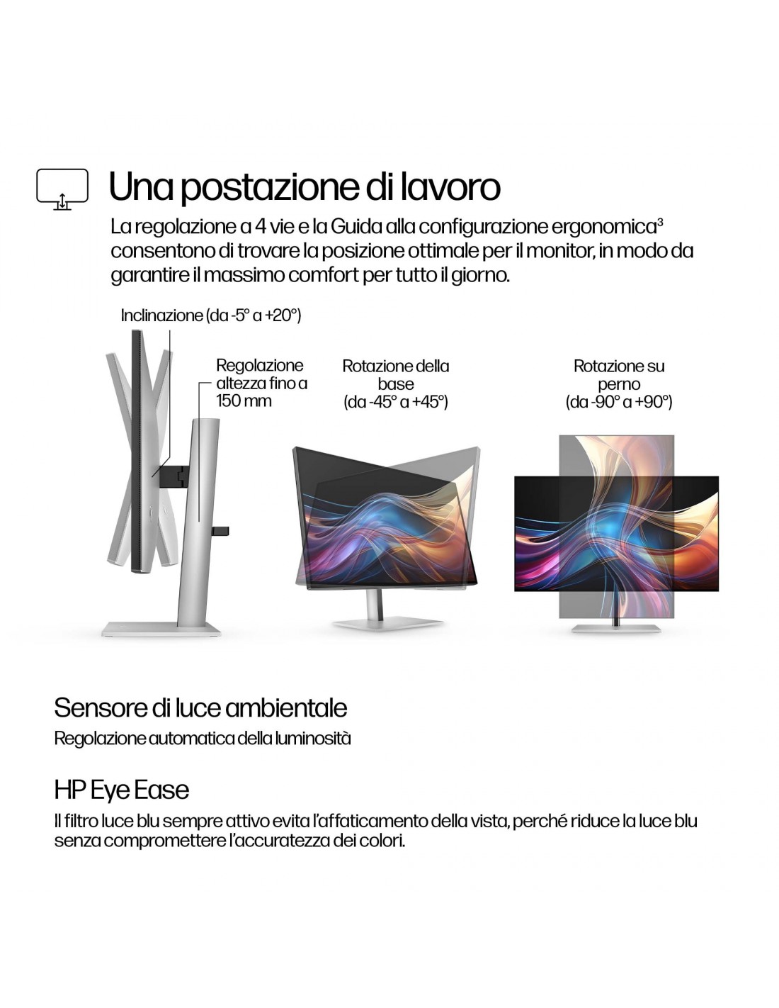 Lavorate all'insegna del massimo comfort per tutto il giorno, cominciando dalla posizione ottimale dello schermo grazie alla regolazione a quattro vie e alla Guida alla configurazione ergonomica.[4] Inoltre, potrete evitare di affaticare la vista, di giorno come di notte, grazie al sensore di luce ambientale che adatta automaticamente la luminosità del monitor.