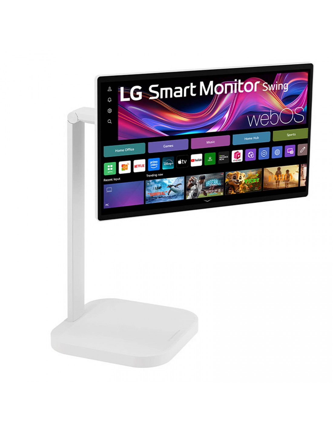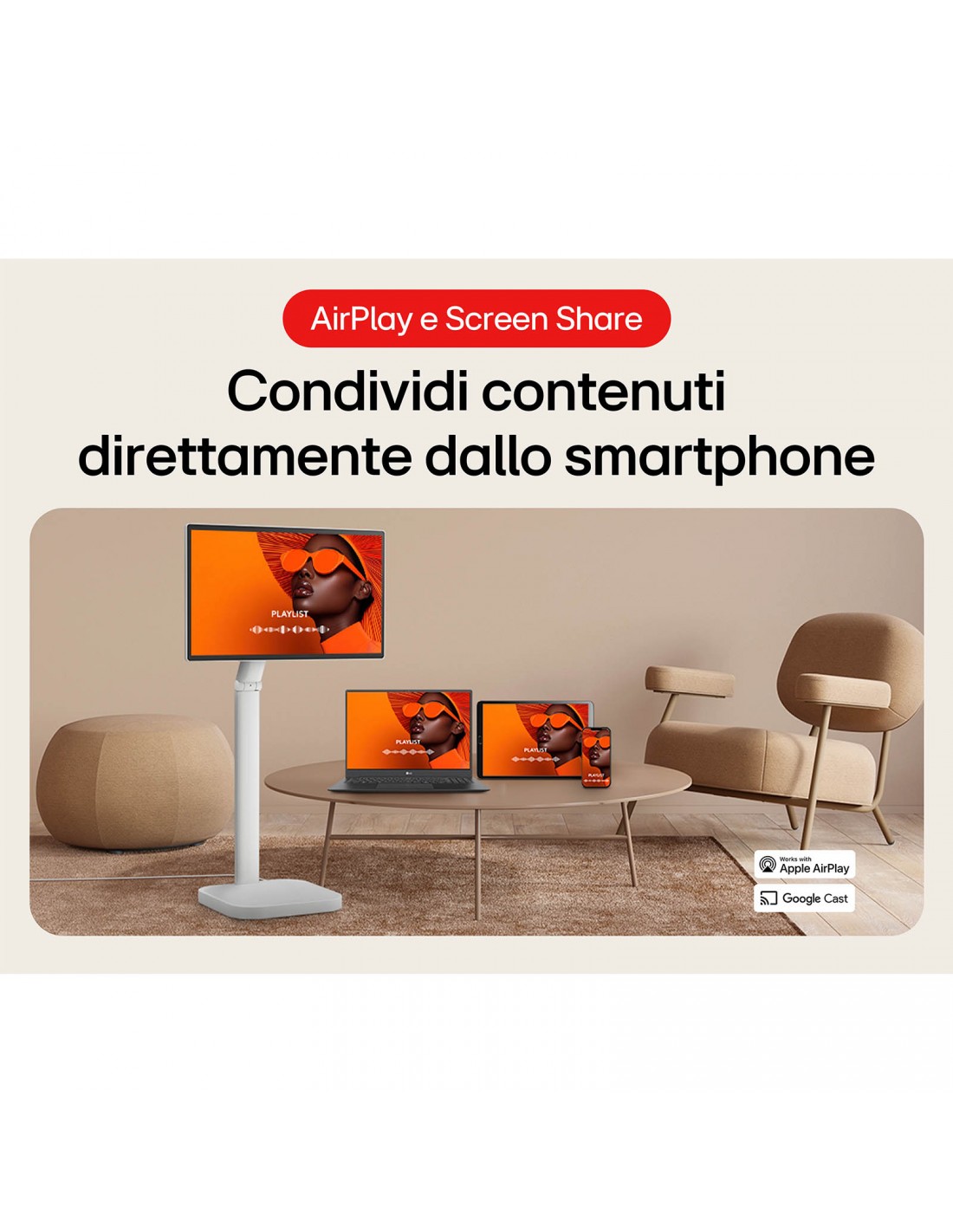 Un nuovo concetto di schermo, pensato per farti godere i tuoi contenuti preferiti su uno schermo ortientabile che puoi spostare da una stanza all'altra della casa grazie alla base con rotelle.