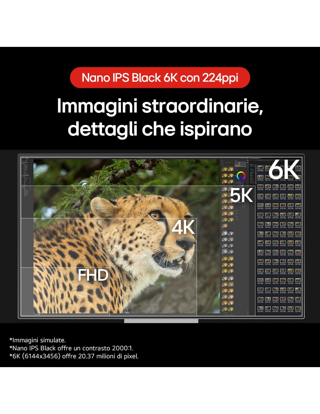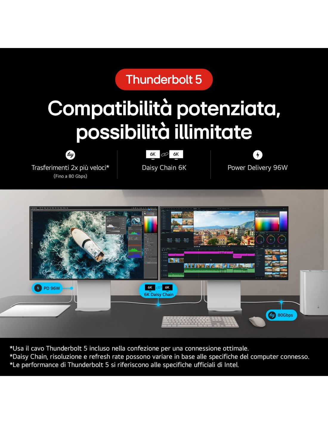Progettato per video editor professionisti, grafici e creator di contenuti che lavorano con flussi di lavoro complessi e con un'alta intensità di dati, grazie al display 6K (6144x3456) e Thunderbolt 5.