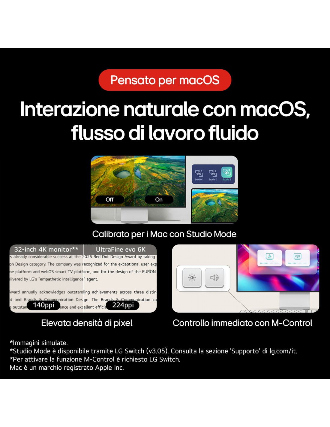 L'interazione con macOS è naturale e senza interruzioni grazie ai preset colore calibrati per Mac (Studio Mode), elevata densità di pixel (224 PPI) e il controllo di luminosità e audio del monitor tramite la tastiera del Mac (M-Control).