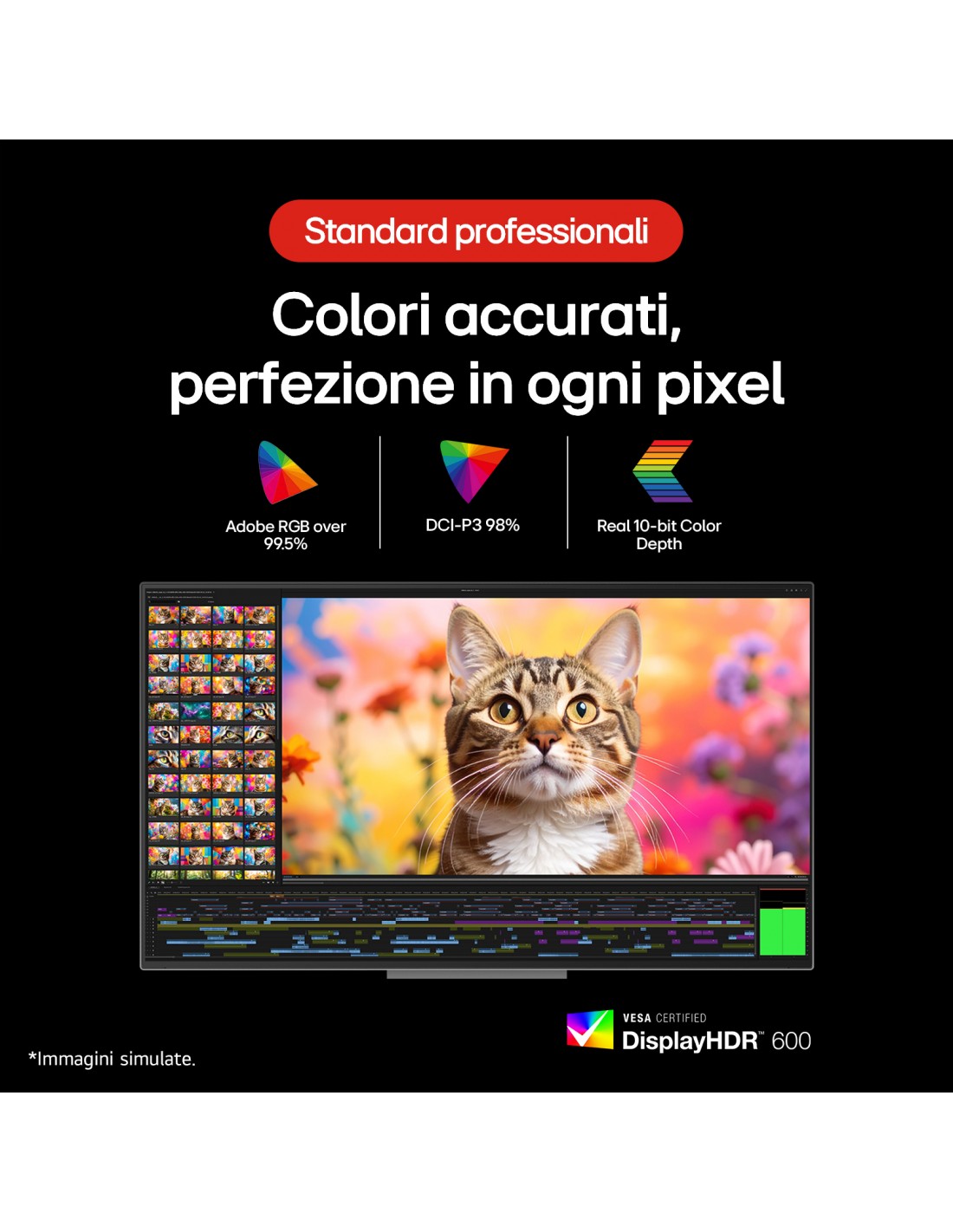 Goditi immagini eccezionali dai colori ricchi e accurati con Adobe RGB 99,5%, DCI-P3 98% e HDR 600, ideale per progetti che richiedono la massima precisione cromatica.
