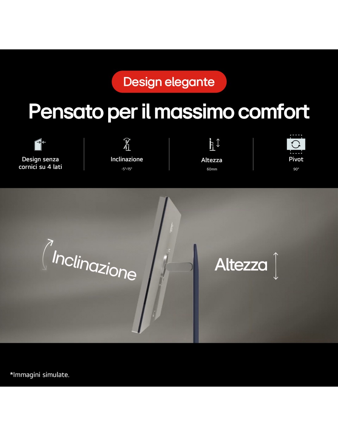 Lo stand elegante e a ingombro minimo è regolabile in altezza, inclinazione e rotazione per creare una postazione di lavoro confortevole e su misura delle tue esigenze."