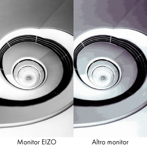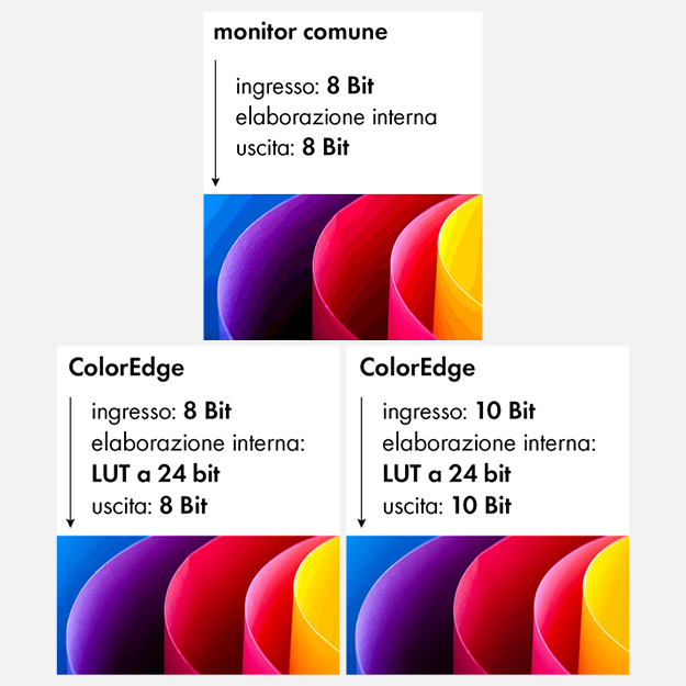 La riproduzione del colore a 10 bit si avvale della tabella colore a 16 bit e sfrutta un ricco spettro cromatico, di gran lunga superiore rispetto ad un monitor a 8 bit. Le gradazioni sono più accurate e le transizioni più raffinate. Importante per la postproduzione: la scala di grigio estesa è in grado di rappresentare un numero superiore di tonalità del grigio dal 6 al 14%.
