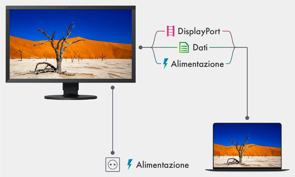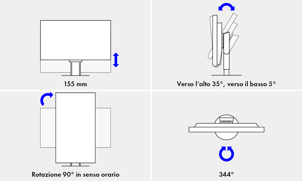 I monitor EIZO possono essere regolati in altezza, inclinati, orientati a destra e a sinistra e, a seconda del modello, abbassati fino alla base del supporto. Ciò consente un'ergonomia ottimale, sia per chi lavora in piedi o per chi sta seduto davanti allo schermo. Il monitor CS2740 può anche essere ruotato nella modalità portrait, molto utile per chi utilizza nei ritratti e arti grafiche la funzione di tethering per il trasferimento dei dati dalla fotocamera al computer.