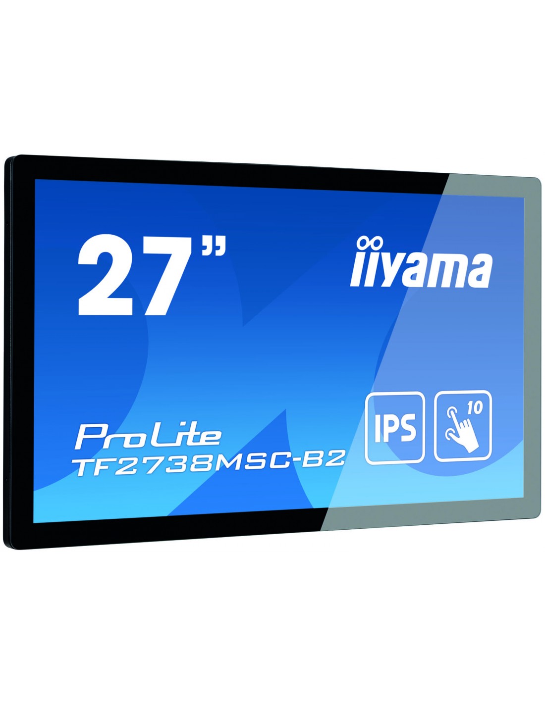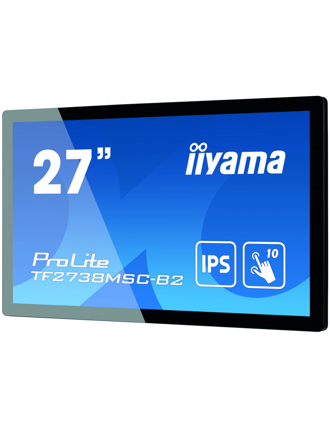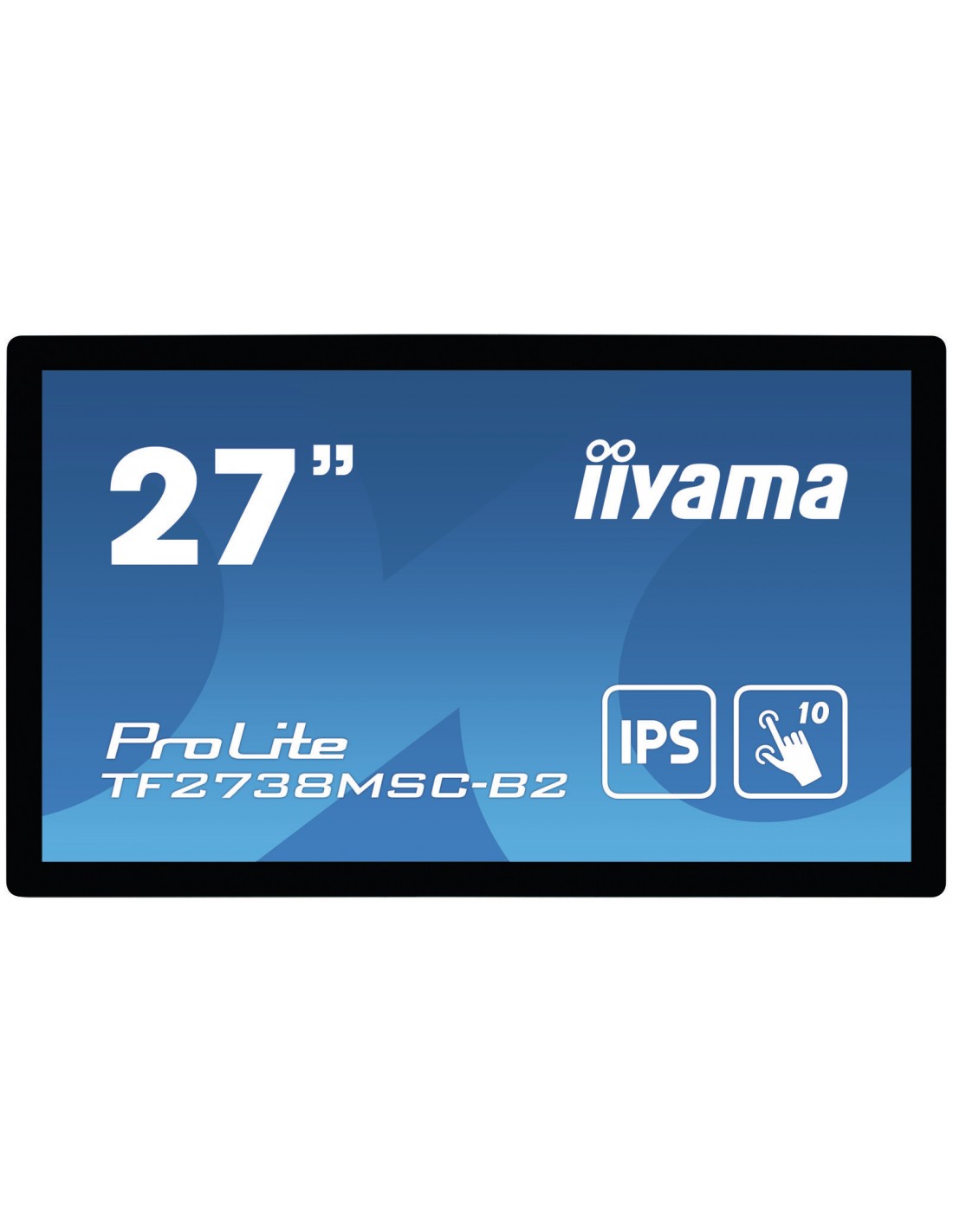 iiyama ProLite TF2738MSC-B2. Dimensioni schermo: 68,6 cm (27"), Luminosità schermo: 500 cd/m², Tipologia HD: Full HD. Colore del prodotto: Nero, Spessore del vetro: 3,6 mm, Durezza della superficie: 6H. Tecnologia touch: Multi-touch, tecnologia touchscreen: Sistema capacitivo progressivo, Tipologia touch screen: Multi utente. Panel mounting interface 24/5000 Interfaccia per montaggio a pannello: 100 x 100,200 x 100 mm, Posizionamento supportato: Orizzontale/Verticale. Tipo alimentazione: AC, Consumi: 25 W, Consumi (modalità stand-by): 1,5 W