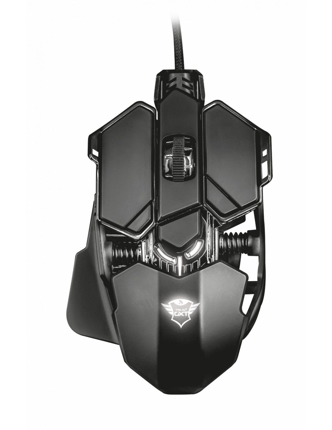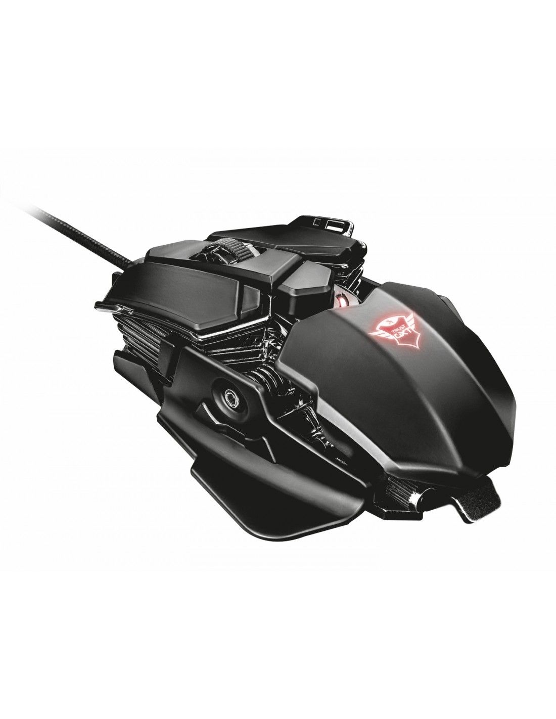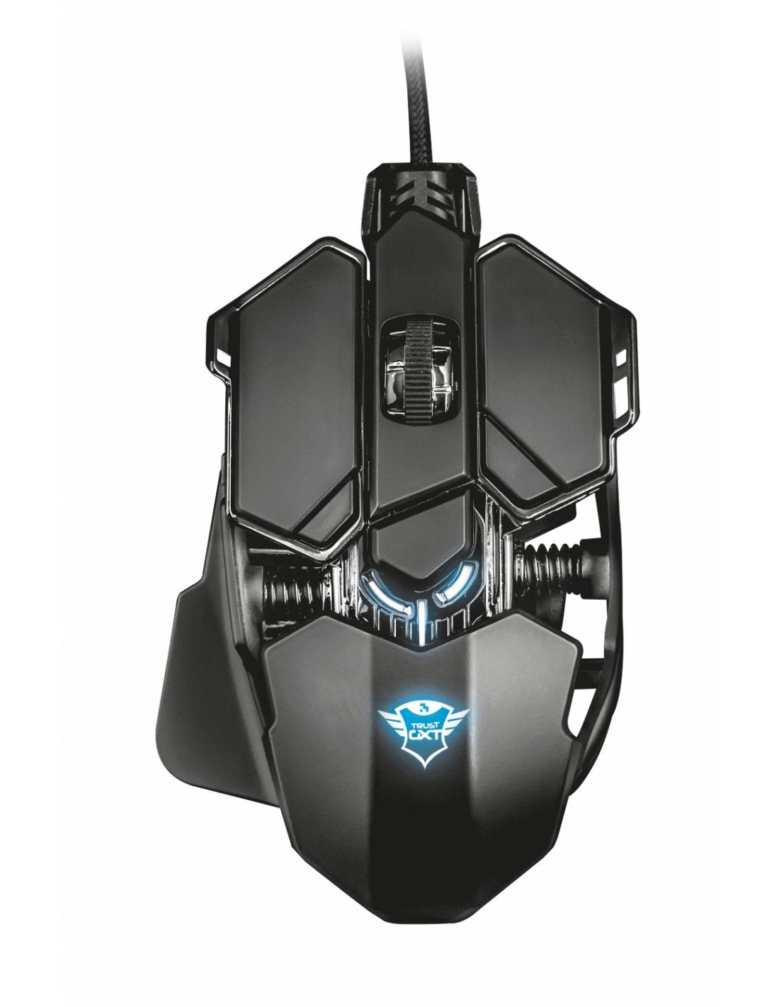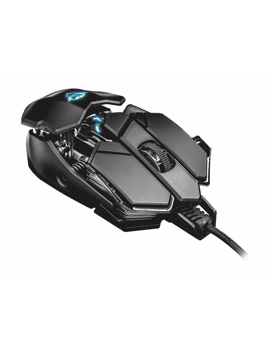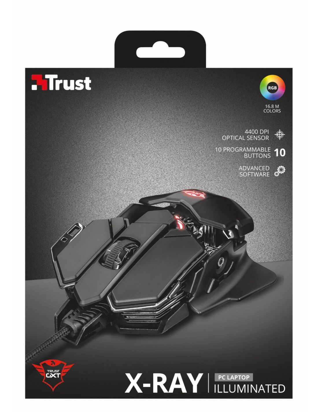 Trust GXT 138 X-RAY. Fattore di forma: Mano destra. Tecnologia di rilevamento del movimento: Ottico, Interfaccia dispositivo: USB, Risoluzione movimento: 4000 DPI, Tipo di pulsanti: Tasti premuti, Numero di tasti: 10, Tipo di scorimmento: Rotella. colore d'illuminazione: Multi. Alimentazione: Cavo. Colore del prodotto: Nero