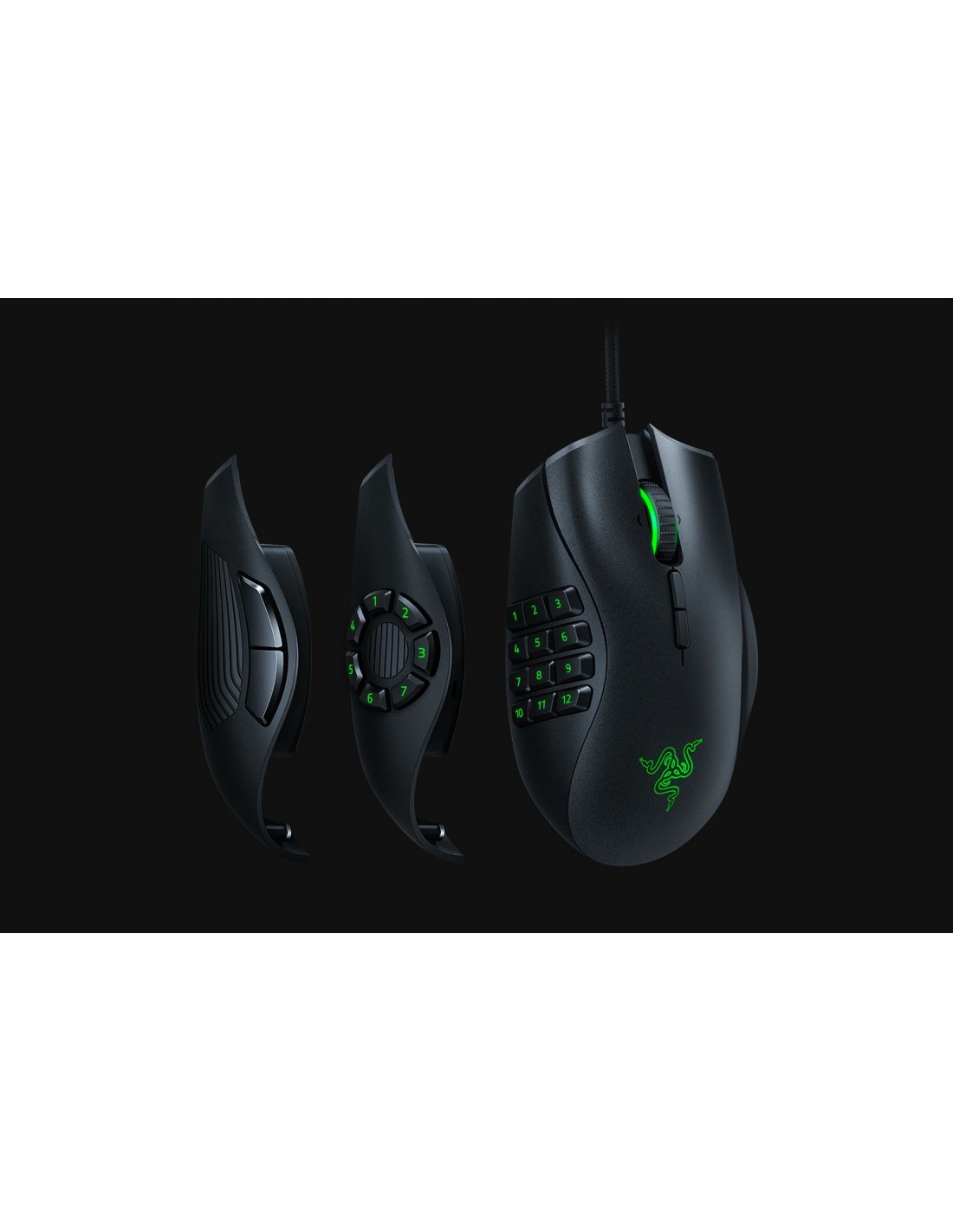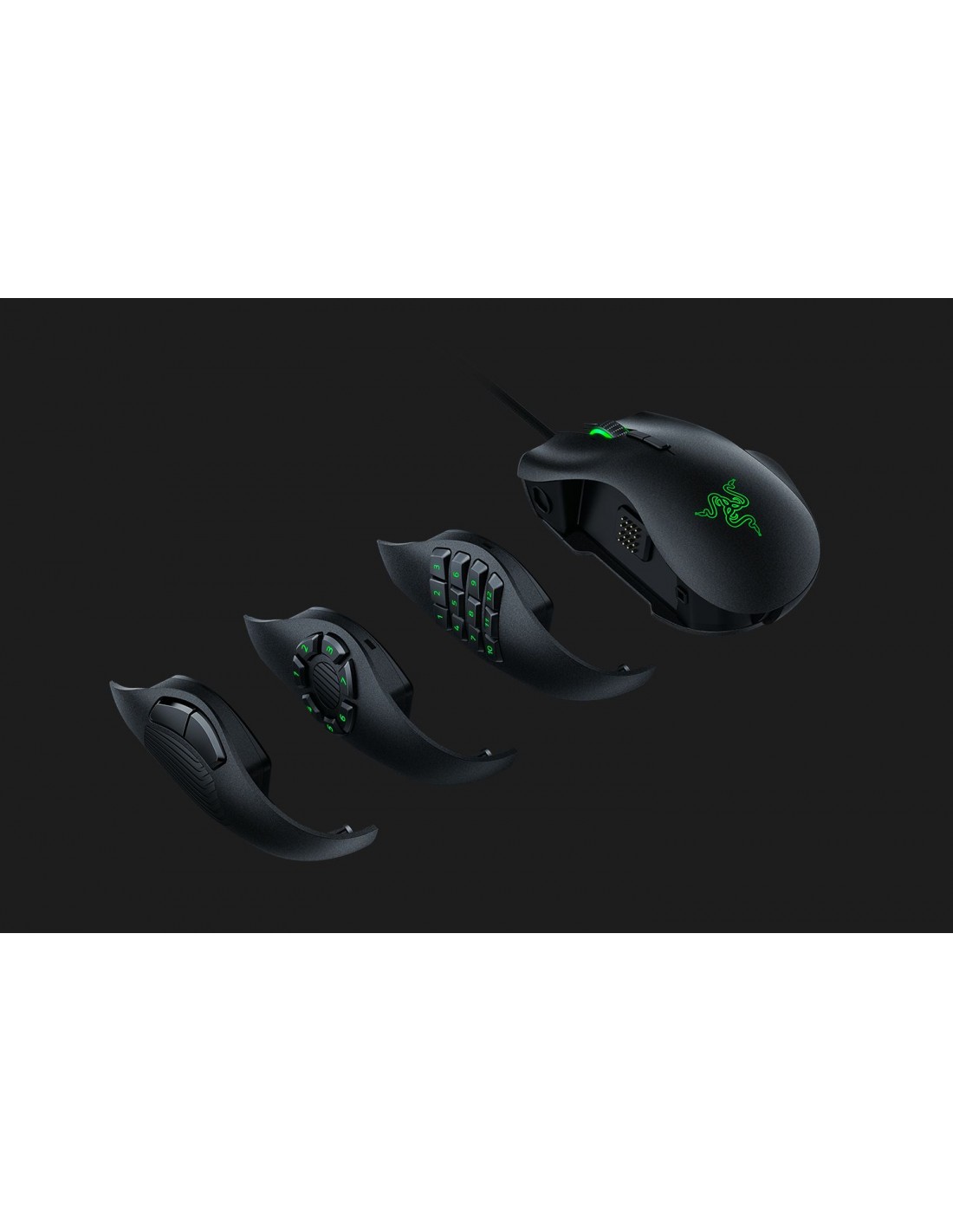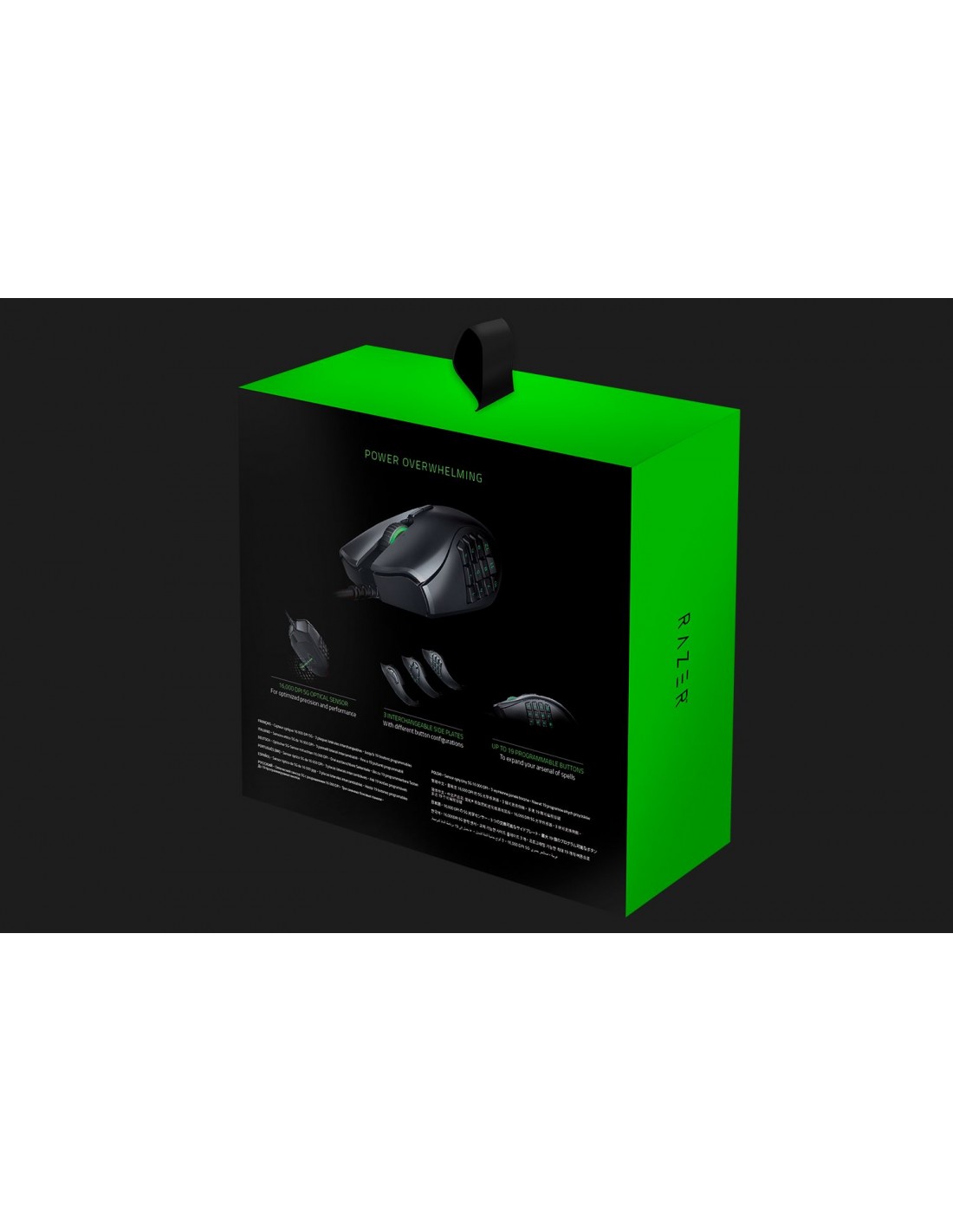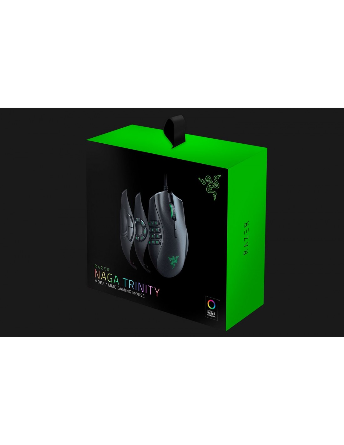 Razer Naga Trinity. Fattore di forma: Mano destra. Tecnologia di rilevamento del movimento: Ottico, Interfaccia dispositivo: USB, Risoluzione movimento: 16000 DPI, Tipo di pulsanti: Tasti premuti, Numero di tasti: 19, Tipo di scorimmento: Rotella, Accelerazione (max): 50 G. Alimentazione: Cavo. Colore del prodotto: Nero, Verde
