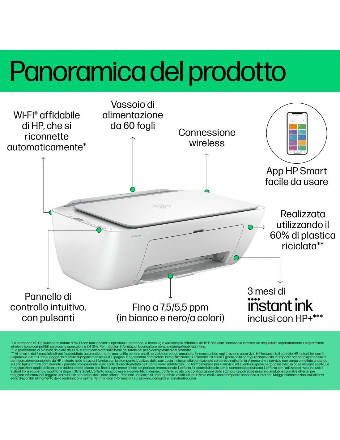 Con questa stampante wireless compatta, perfetta per le esigenze di tutti i giorni, e l'app di stampa migliore della categoria, esegui stampe, copie e scansioni con la massima semplicità. Dalle etichette di reso alle ricette, HP ti offre un'esperienza di stampa semplificata al massimo, degna di un leader nel settore stampanti.[2,3]Stampante dotata di misure di sicurezza dinamica Alcune stampanti HP sono predisposte per funzionare solo con cartucce con chip HP nuovo o riutilizzato o con circuito elettronico HP nuovo o riutilizzato. Tali stampanti sono dotate di misure di sicurezza dinamica che bloccano le cartucce con chip non HP o con circuito elettronico modificato o non HP. L’efficacia di tali misure di sicurezza sarà garantita tramite il periodico rilascio di aggiornamenti firmware, che bloccheranno eventuali cartucce con chip o circuito elettronico non HP in precedenza funzionanti. I chip o circuiti elettronici HP riutilizzati abilitano il funzionamento di cartucce riutilizzate, rigenerate e ricaricate.