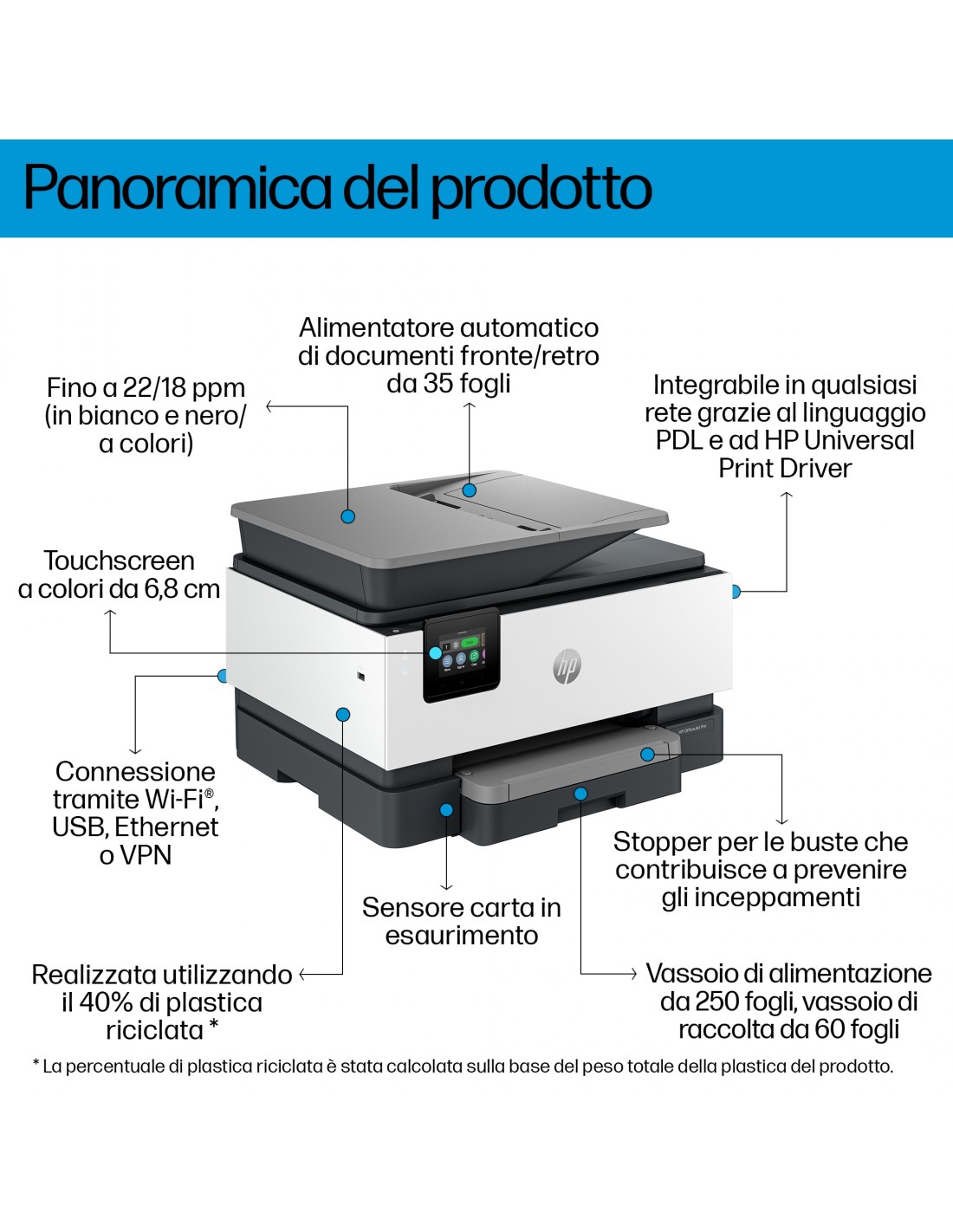 Ottieni una qualità di stampa straordinaria con la stampante a getto d'inchiostro a colori ideale per uffici distribuiti e ambienti di lavoro ibridi. L'affidabilità e le tecnologie più avanzate di HP ti aiutano inoltre a integrare le stampanti in qualsiasi rete con la massima semplicità. Funzionalità di copia, scansione e fax incluse.[1,2]Stampante dotata di misure di sicurezza dinamica Alcune stampanti HP sono predisposte per funzionare solo con cartucce con chip HP nuovo o riutilizzato o con circuito elettronico HP nuovo o riutilizzato. Tali stampanti sono dotate di misure di sicurezza dinamica che bloccano le cartucce con chip non HP o con circuito elettronico modificato o non HP. L’efficacia di tali misure di sicurezza sarà garantita tramite il periodico rilascio di aggiornamenti firmware, che bloccheranno eventuali cartucce con chip o circuito elettronico non HP in precedenza funzionanti. I chip o circuiti elettronici HP riutilizzati abilitano il funzionamento di cartucce riutilizzate, rigenerate e ricaricate.