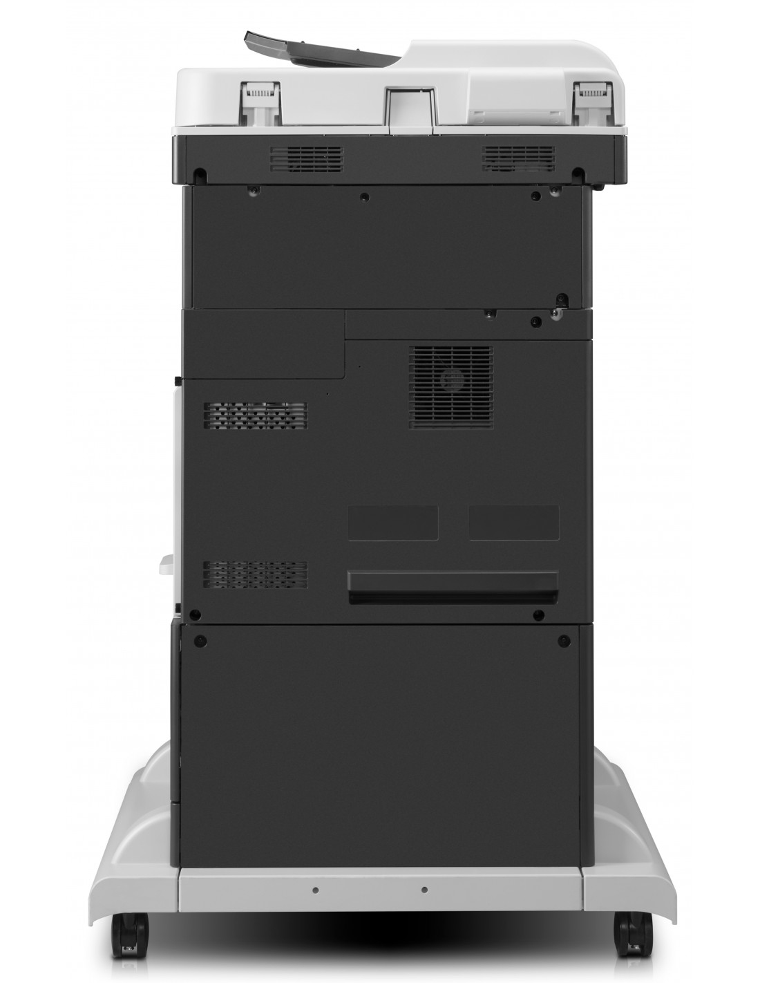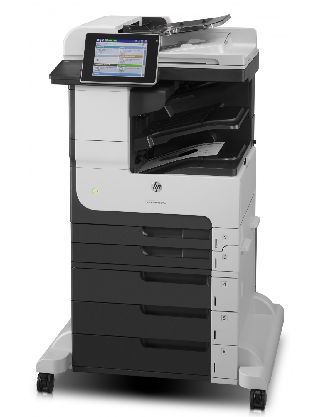 Come stampante multifunzione HP LaserJet Enterprise M725dn, con fax incorporato; Fascicolatore/cucitrice da 500 fogli in linea; 3 alimentatori con supporto da 500 fogli.