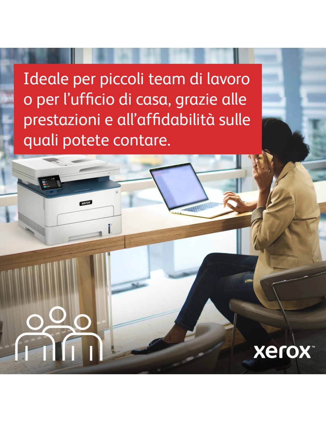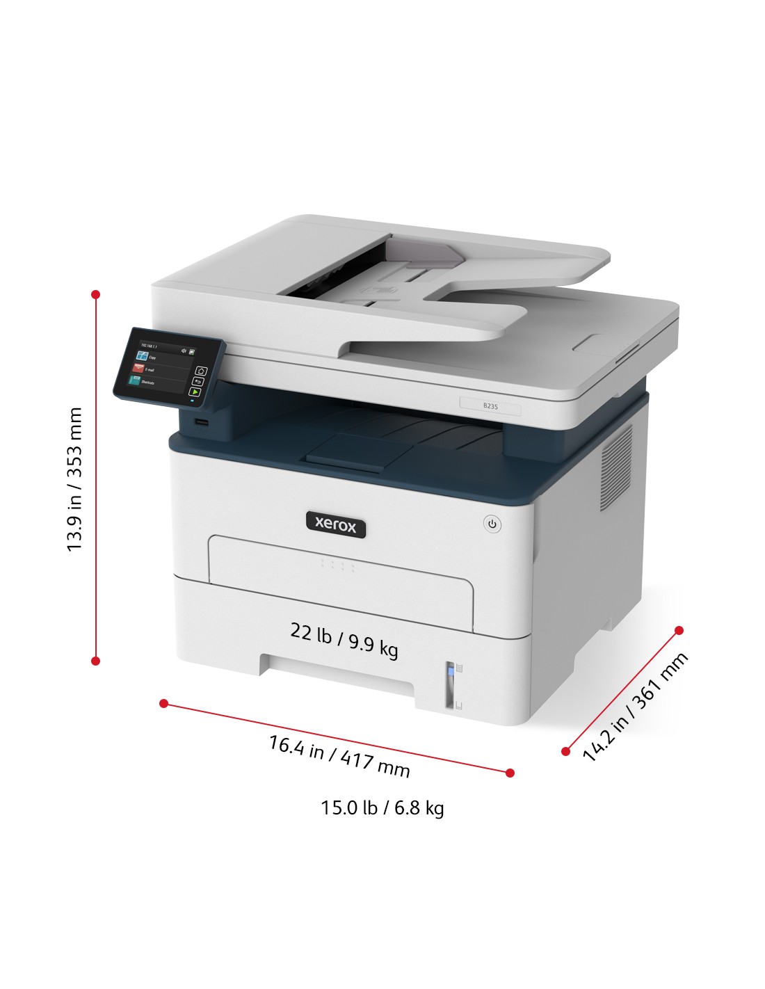 Xerox B235 A4 34 ppm Copia/Stampa/Scansione/Fax fronte/retro wireless PS3 PCL5e/6 ADF 2 vassoi Totale 251 fogli. Tecnologia di stampa: Laser, Stampa: Mono stampa, Risoluzione massima: 600 x 600 DPI. Copia: Mono copia, Risoluzione di copia massima: 600 x 600 DPI. Scansione: Scansione a colori, Risoluzione di scansione ottica: 1200 x 1200 DPI. Fax: Mono fax. Funzione duplex: Copia, Fax, Stampa. Massimo formato carta serie ISO A: A4. Wi-Fi. Stampa diretta. Colore del prodotto: Blu, Bianco