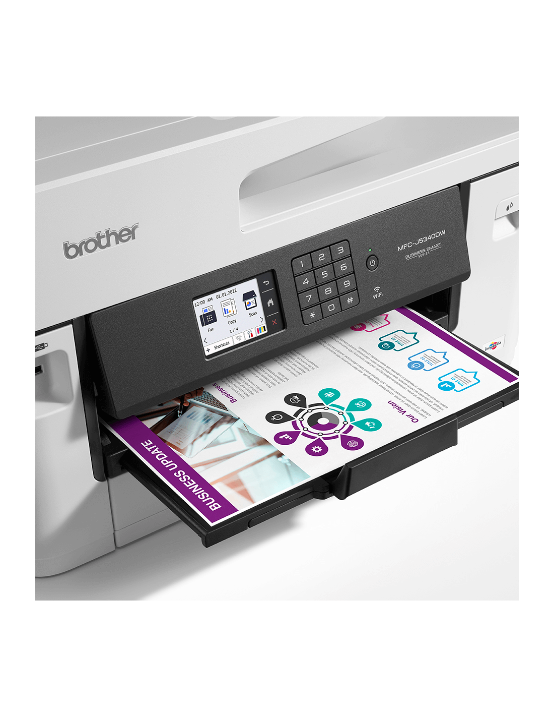 Brother MFC-J5340DW. Tecnologia di stampa: Ad inchiostro, Stampa: Stampa a colori, Risoluzione massima: 1200 x 4800 DPI. Copia: Copia a colori, Risoluzione di copia massima: 600 x 600 DPI. Scansione: Scansione a colori, Risoluzione di scansione ottica: 600 x 600 DPI. Fax: Fax a colori. Funzione duplex: Stampa. Massimo formato carta serie ISO A: A3. Wi-Fi. Stampa diretta. Colore del prodotto: Nero, Bianco