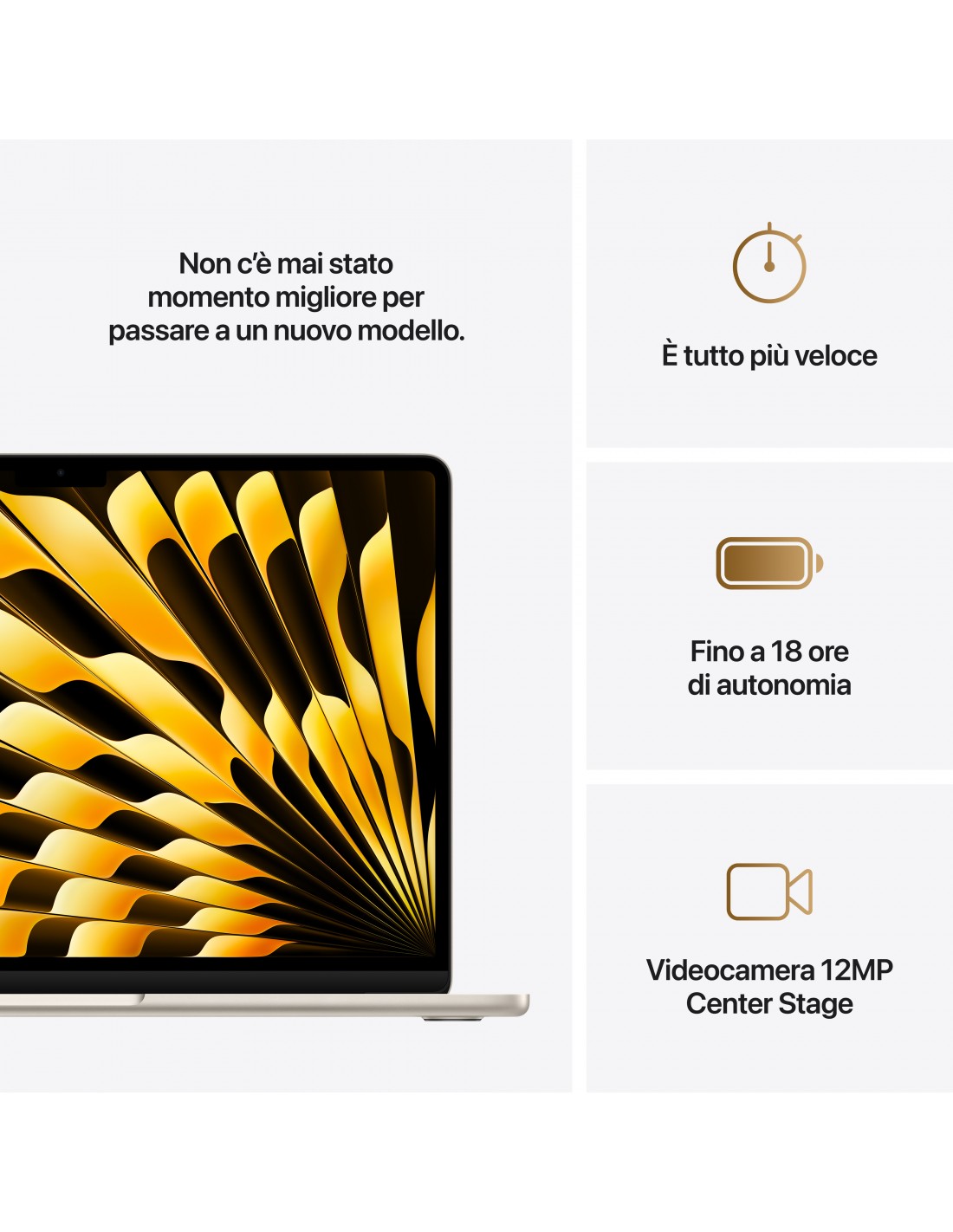 Con il chip M4, MacBook Air 13" ti fa sfrecciare in scioltezza fra i tuoi impegni e le tue passioni. Ha Apple Intelligence, uno splendido display Liquid Retina e un design estremamente sottile e leggero. È fatto per durare a lungo, e con una batteria che dura fino a 18 ore è pronto a seguirti in tutto, dappertutto.