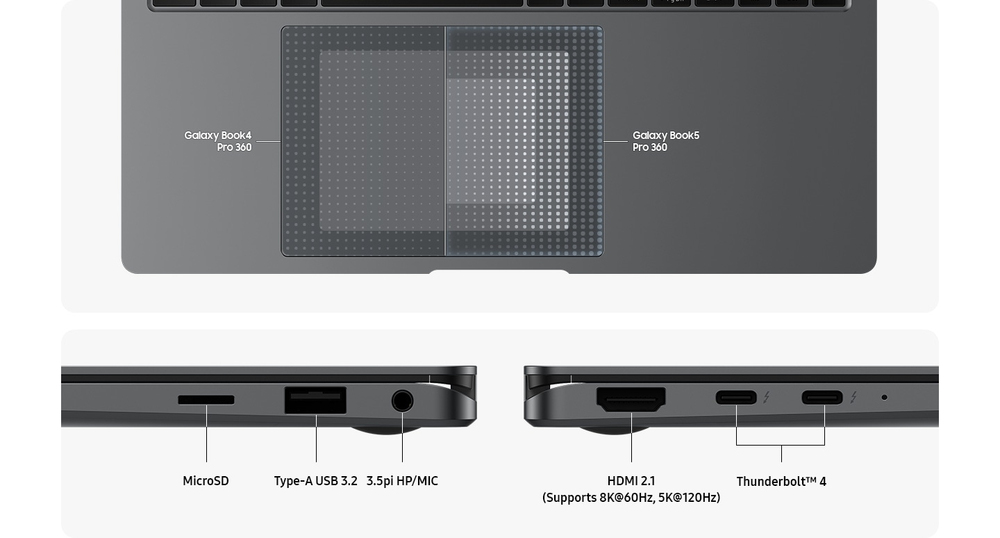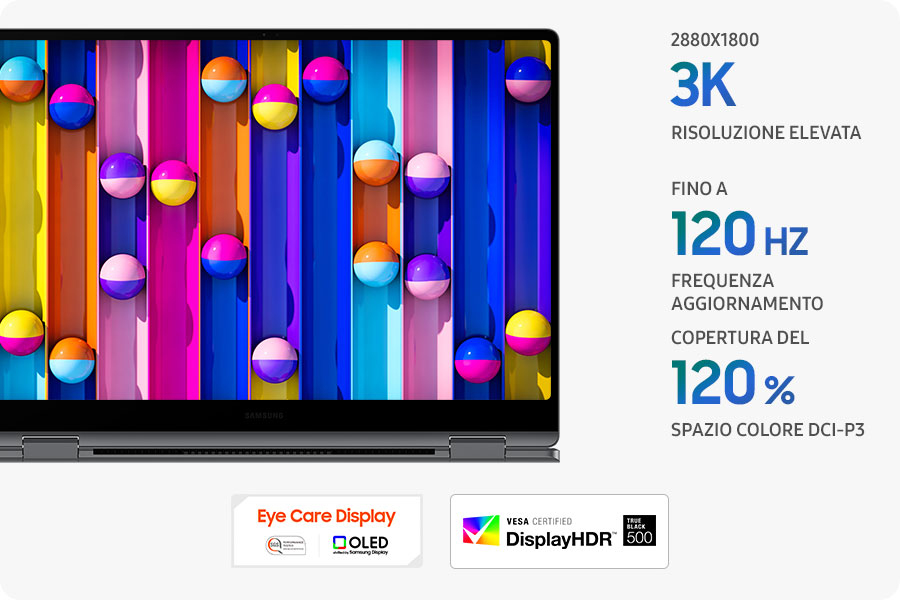 Galaxy Book5 Pro 360 è ora dotato di altoparlanti da 38 mm, grandi più del doppio rispetto ai precedenti: potrai assaporare i bassi in ogni battito, con un suono incredibilmente ricco nelle basse frequenze. E in più i quattro altoparlanti sono ottimizzati con Dolby Atmos, per un audio surround super coinvolgente.