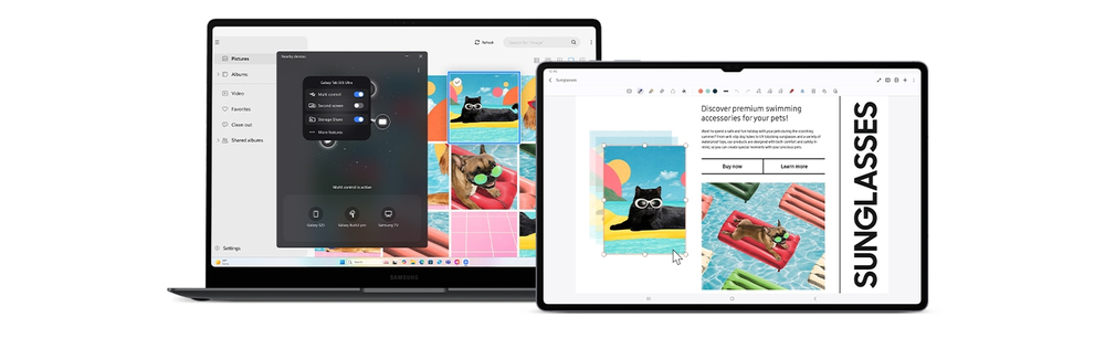 Con la funzione Nearby Devices potrai collegare e utilizzare i dispositivi Galaxy in pochi istanti. Apri il menu di Galaxy Book5 Pro 360 per collegare i dispositivi con un semplice drag and drop, quindi avvia funzioni intuitive come Controllo Multiplo e Condivisione Archiviazione tra telefono, PC e Tab, tutto da un unico hub di connettività.