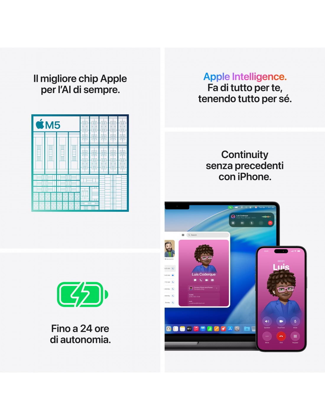 - PROGETTATO PER APPLE INTELLIGENCE – Apple Intelligence è il sistema di intelligenza personale che rende più facile scrivere, creare e fare tutto ciò che vuoi. E grazie a una protezione totale della privacy, hai la certezza che nessuno potrà accedere ai tuoi dati, nemmeno Apple.