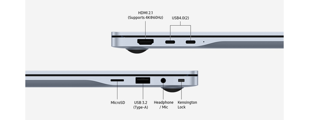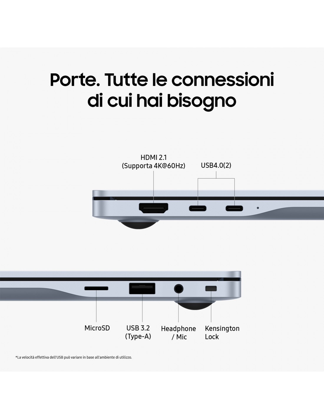 Porte integrate e versatili che ti consentono di collegare più dispositivi al tuo Galaxy Book4 Edge da 15,6", senza adattatori e in maniera intuitiva. Potrai trasferire dati alla velocità della luce grazie a due porte USB 4.0 e collegarti con facilità tramite HDMI 2.1 (disponibile per contenuti a 60 Hz in 4K), USB 3.2 Tipo A, cuffie/microfono e slot Kensington. Inoltre, la ricarica con funzione Power Delivery con connettore USB-C è la soluzione ideale per alimentare rapidamente gli altri dispositivi Galaxy compatibili.