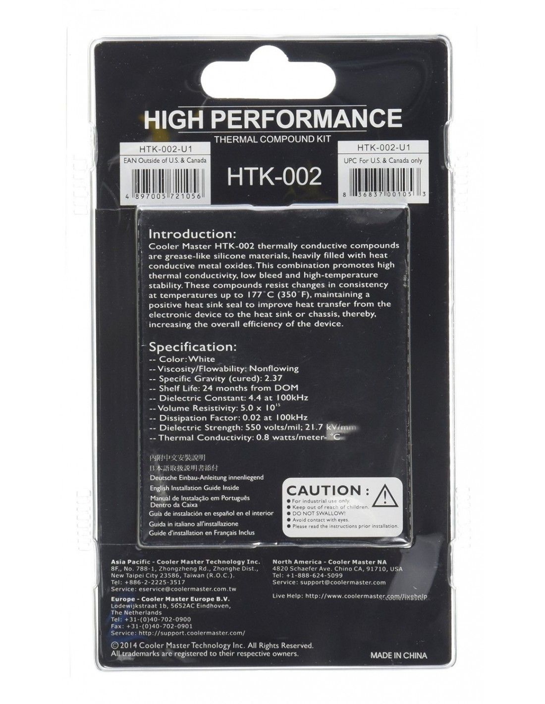 Cooler Master HTK-002. Colore del prodotto: Bianco. Peso: 4,6 g. Larghezza imballo: 102 mm, Profondità imballo: 171 mm, Altezza imballo: 40 mm
